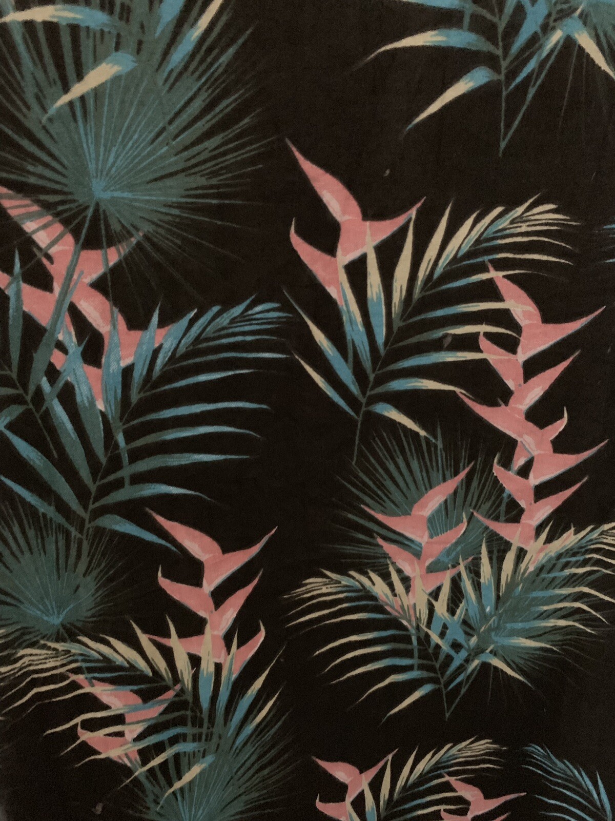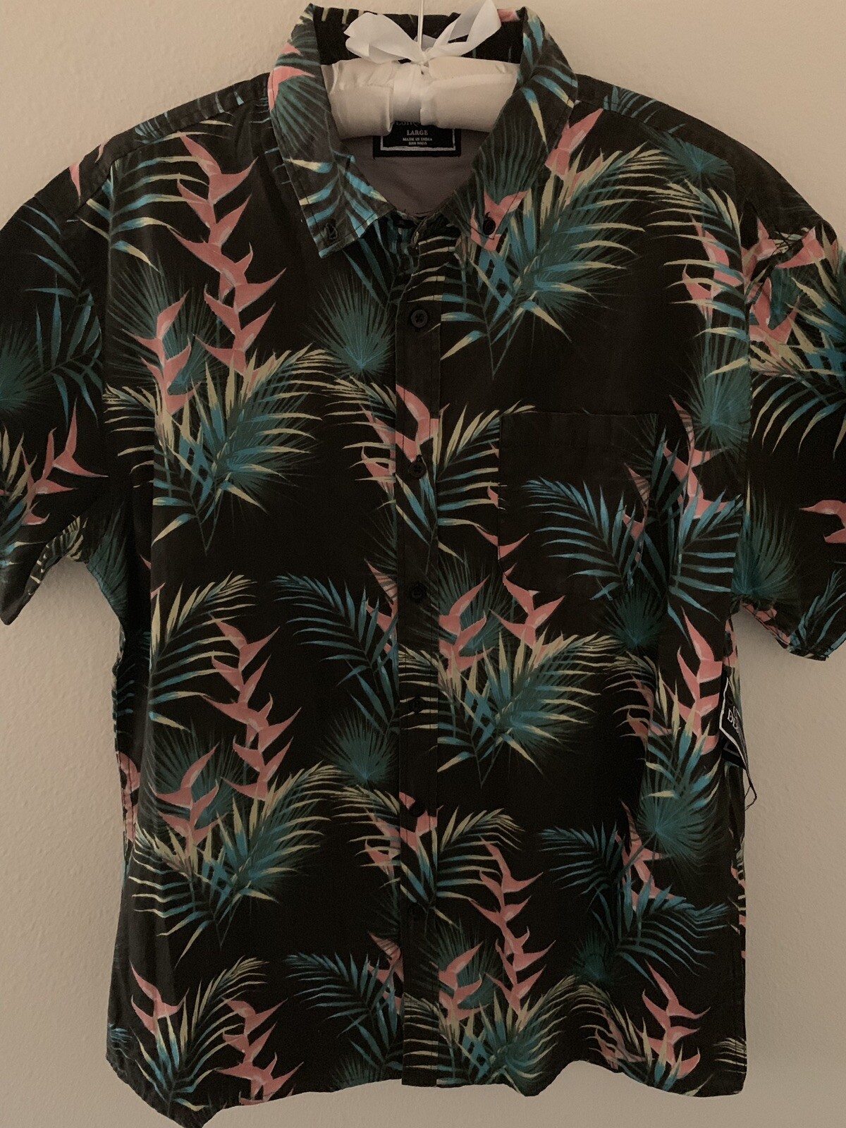 NWT L Hawaiian Faded Black Tropical Leaves Button Shirt Large Pink Blue Leaf
