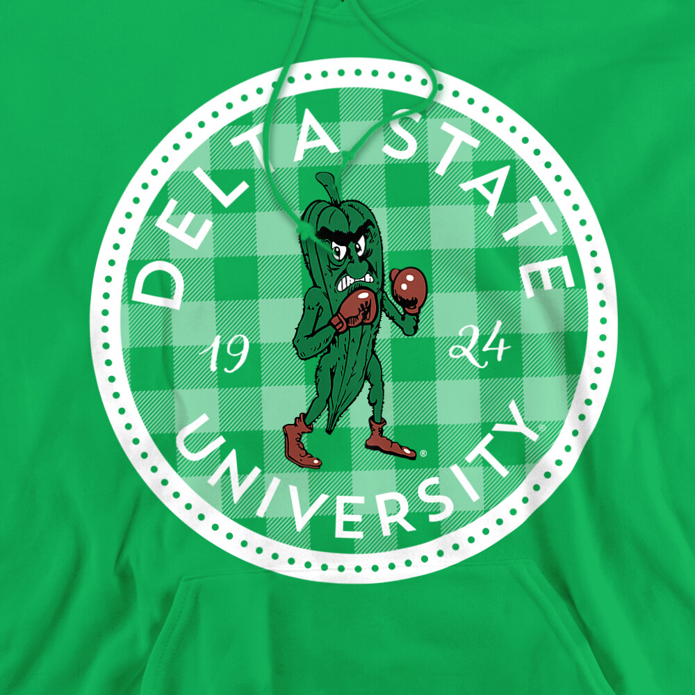 Delta State University Adult Pullover Hoodie Plaid Badge, Kelly Green, S-3XL