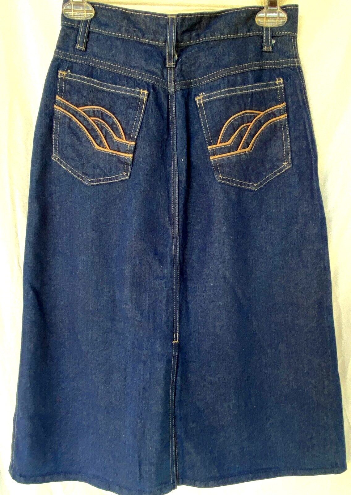 VTG 70s..MIDI..FRONT BACK SLIT..EMBROIDERED POCKETS..DENIM..SKIRT..NEW..sz 6