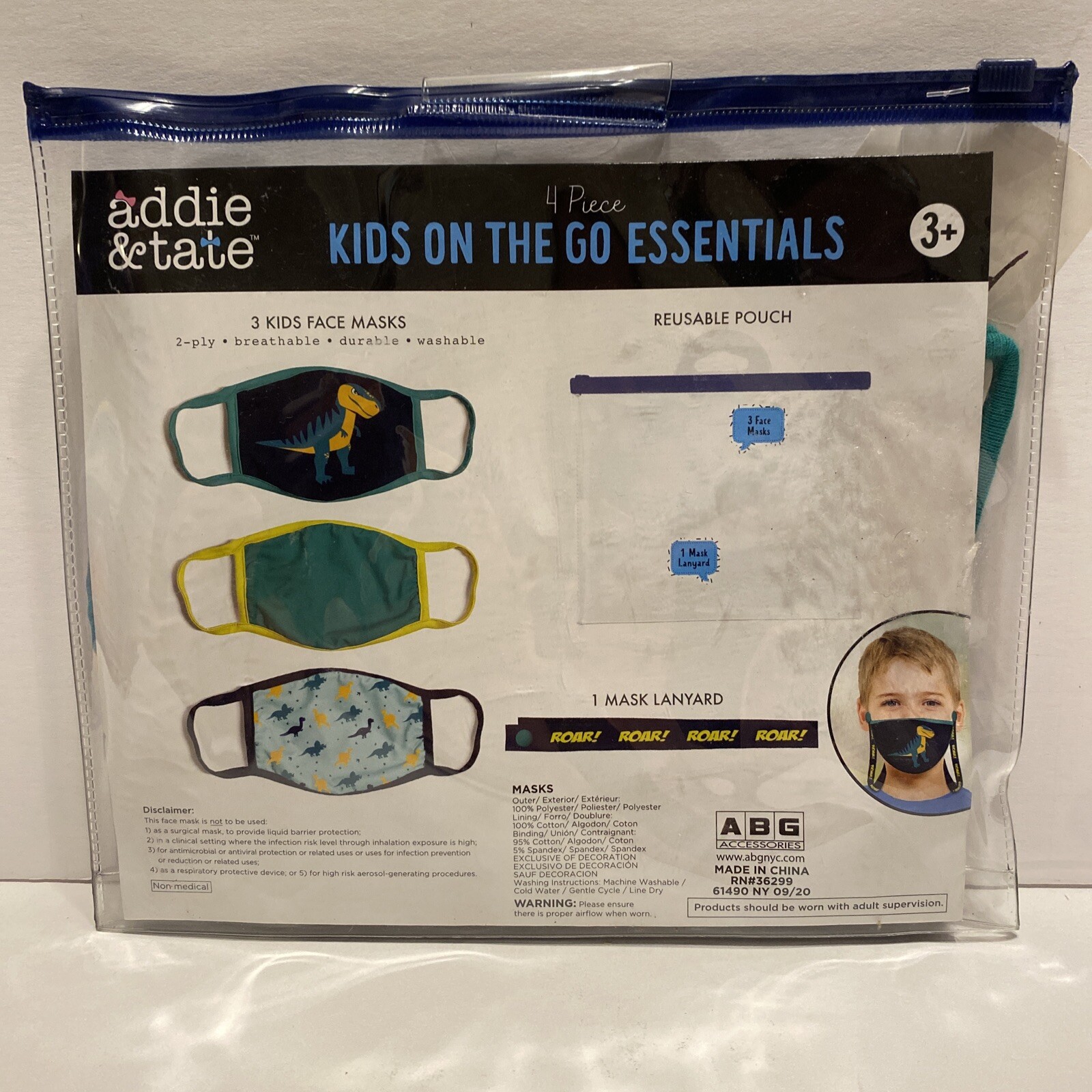 3 Addie Tate Washable Kids Face Masks PLUS 1 Mask Lanyard Dinosaur Pouch 1A