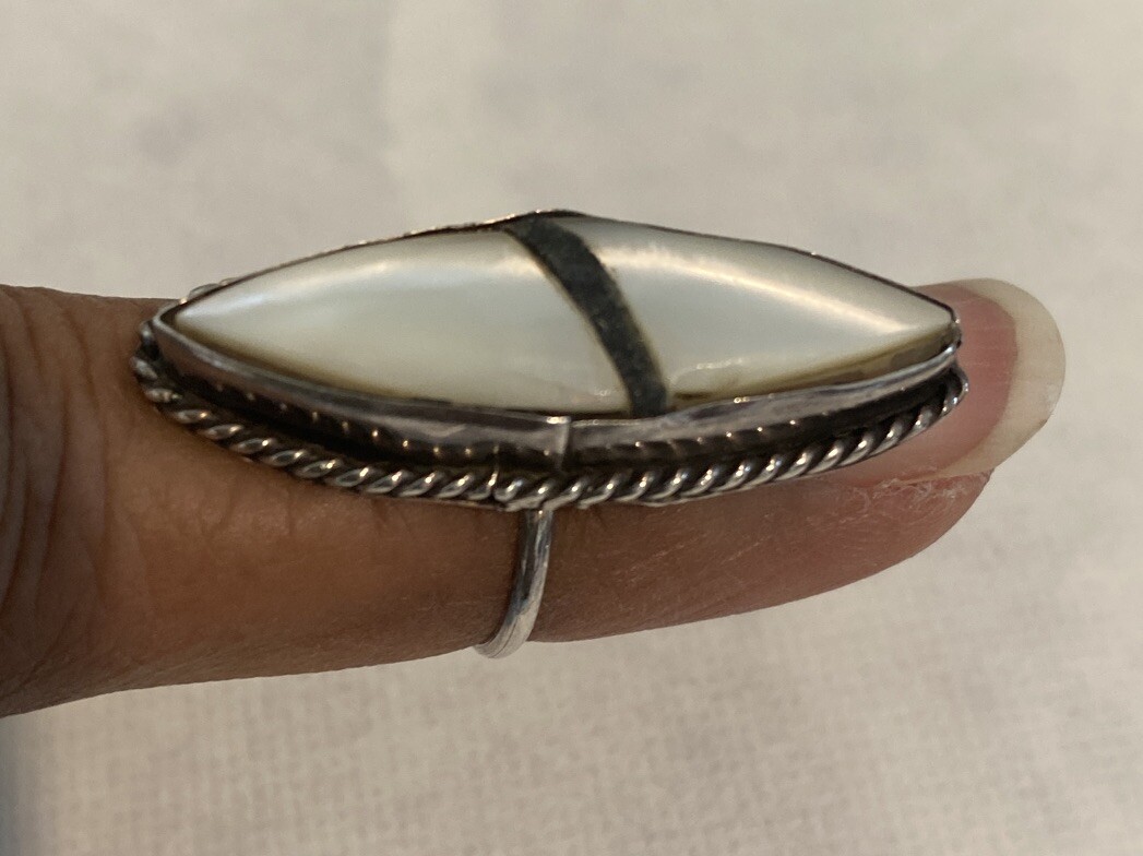 Sterling Silver Mother of Pearl Onyx Inlay Ring Native American Size 4.5