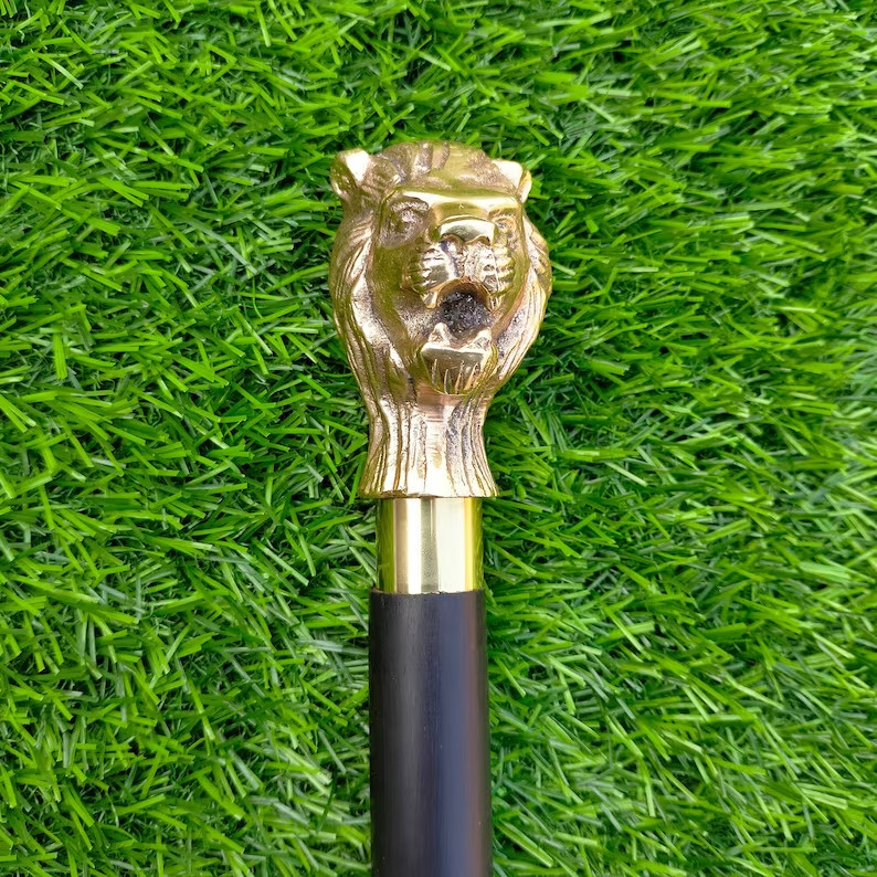 как выглядит Golden Lion Head Style Handle Wooden Walking Stick Cane Black Inlay , An Elegan фото