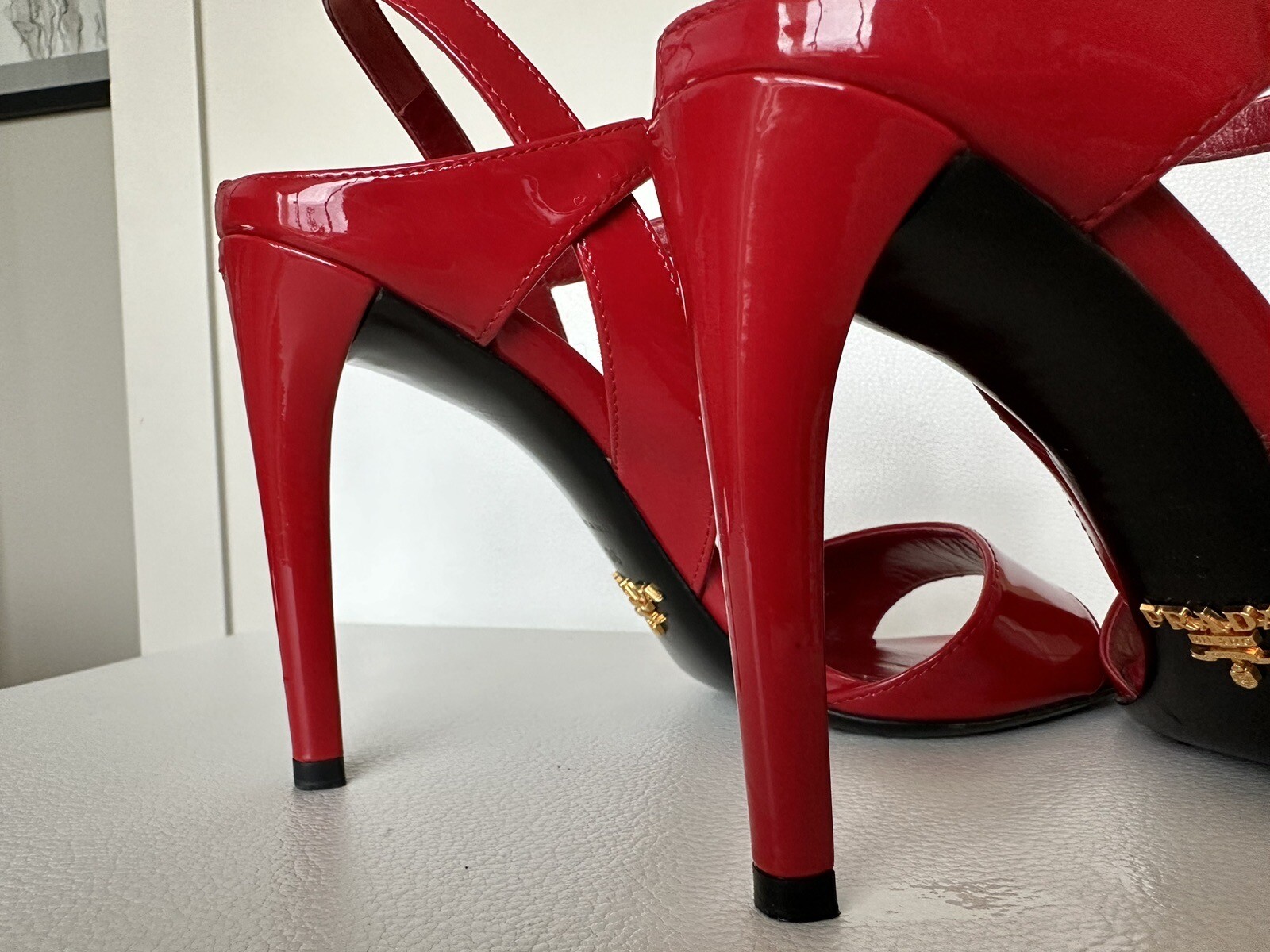 Prada Stiletto Red Patent Leather Sandals Ankle Strap Size EU 38, US 7.5-8
