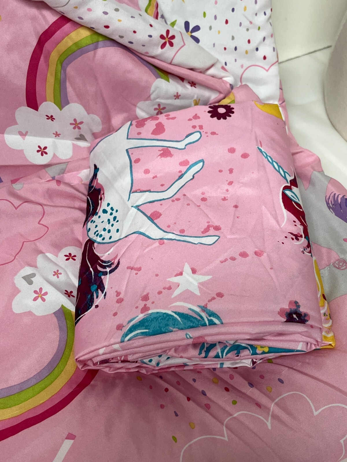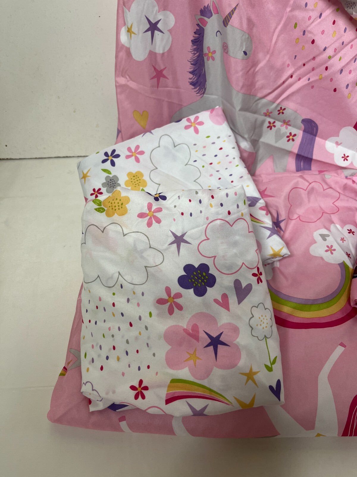 Child Crib Sheet Quilt Set w Matching Shower Curtain Pink Unicorns Rainbows