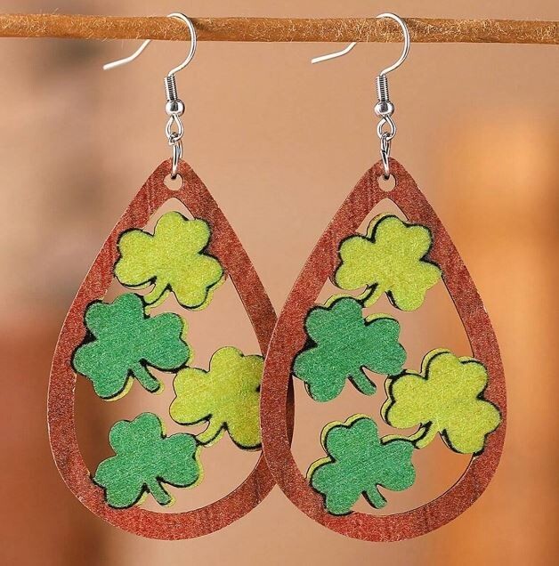 Wooden Shamrock St Patrick's Day Green Clover Dangle Wood Teardrop Earrings NEW