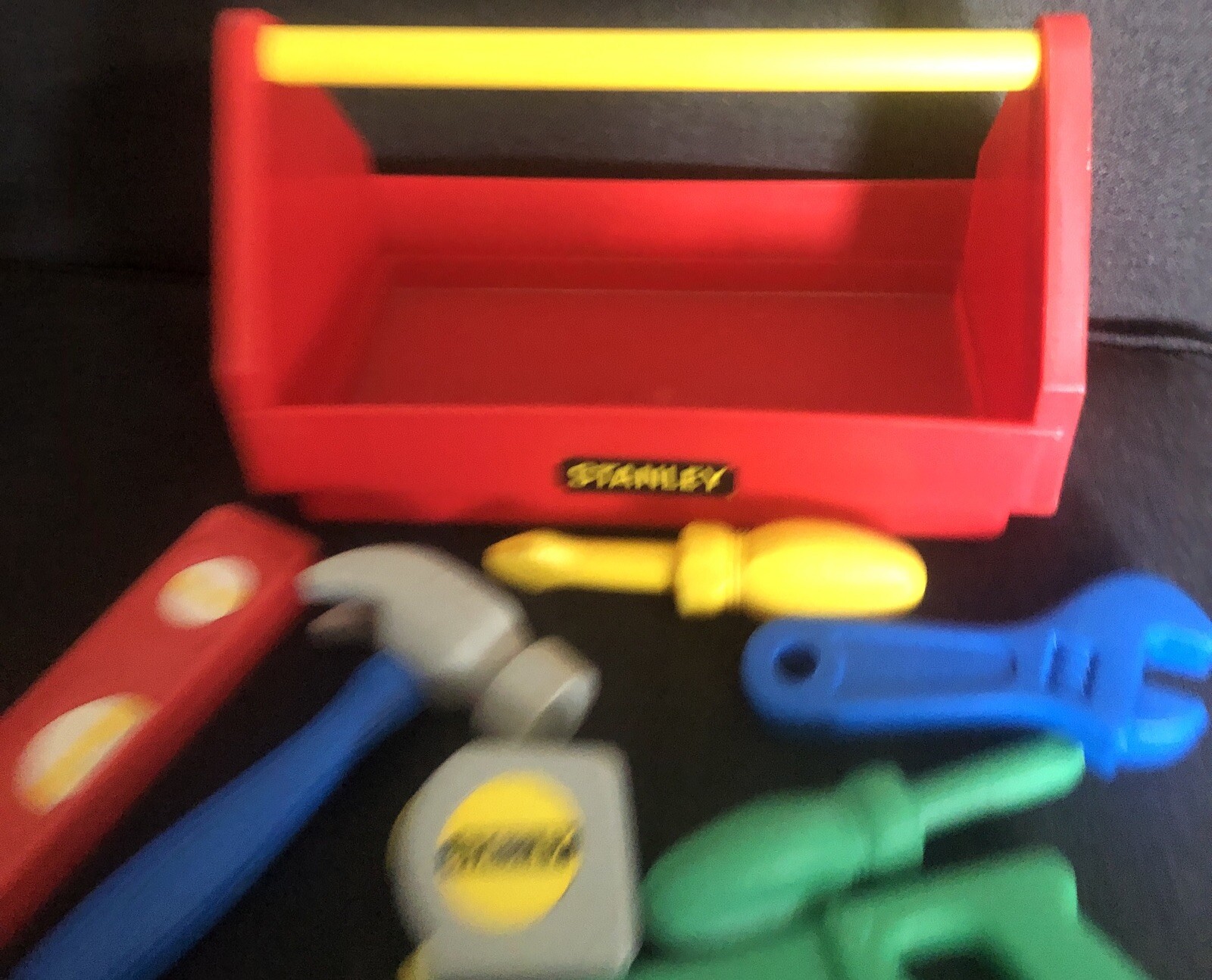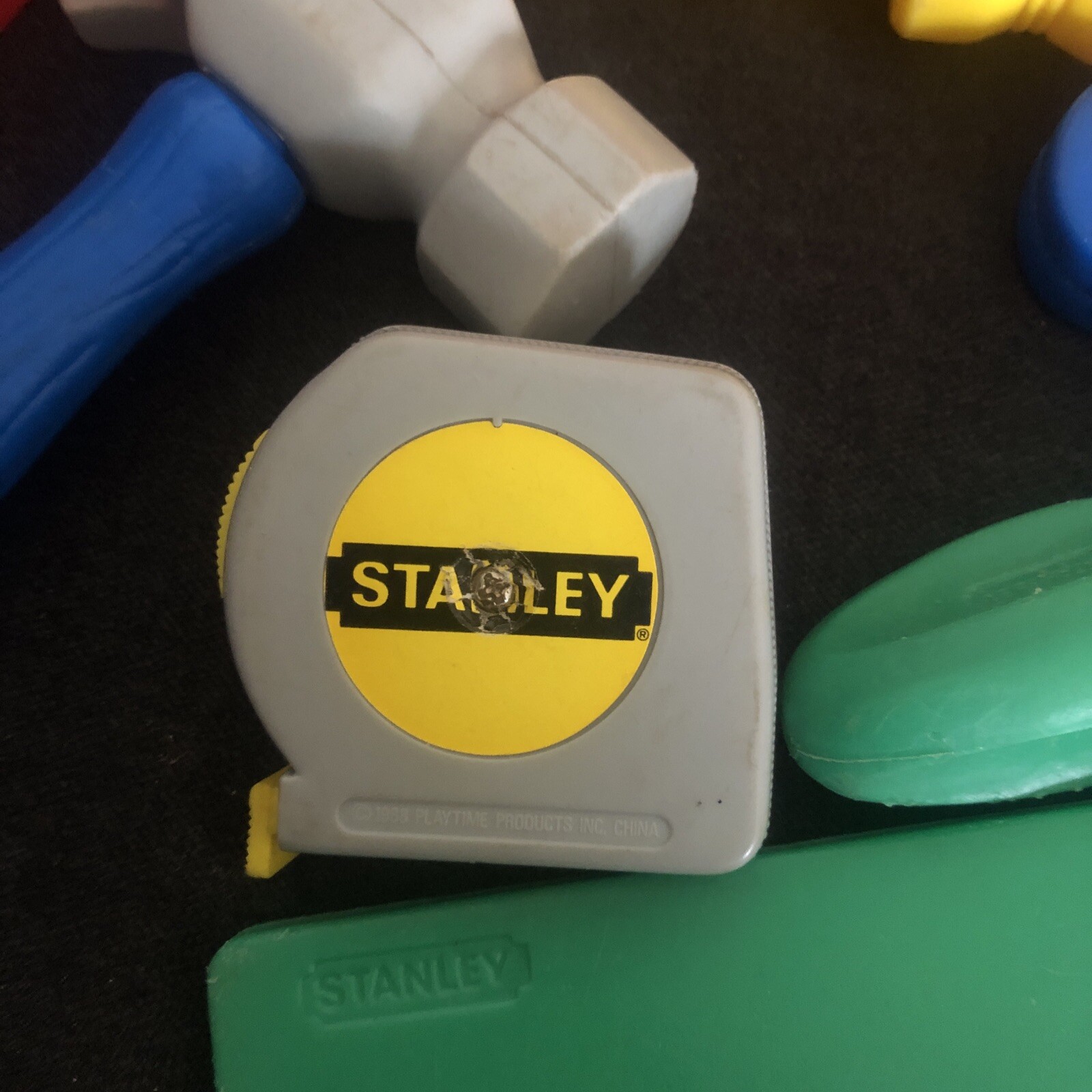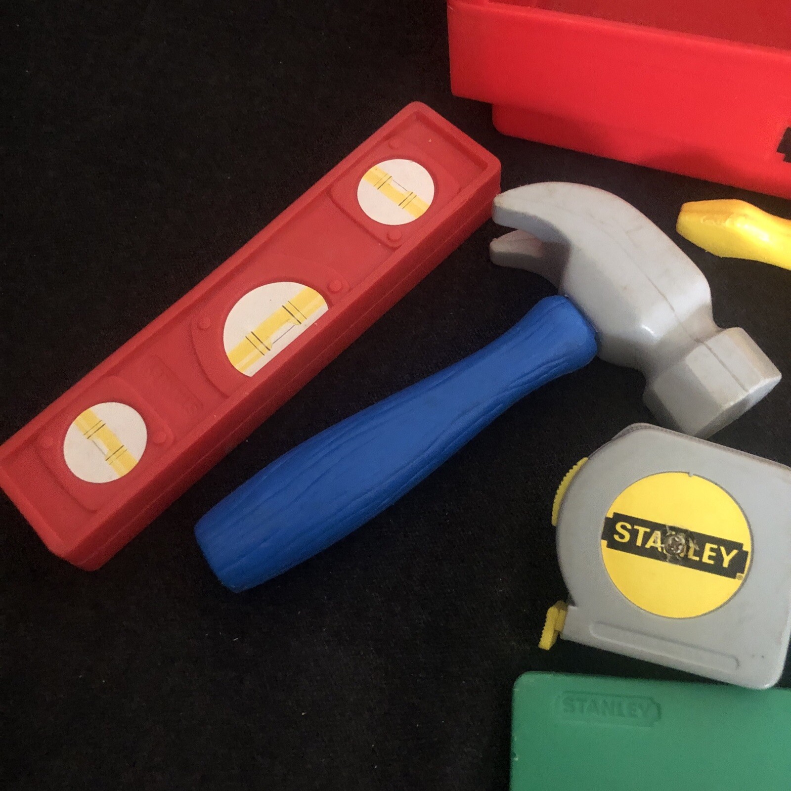 Vintage 1988 Stanley Playtime Tool Box 7 Tools Pieces Toy Hammer Saw Tape Lot