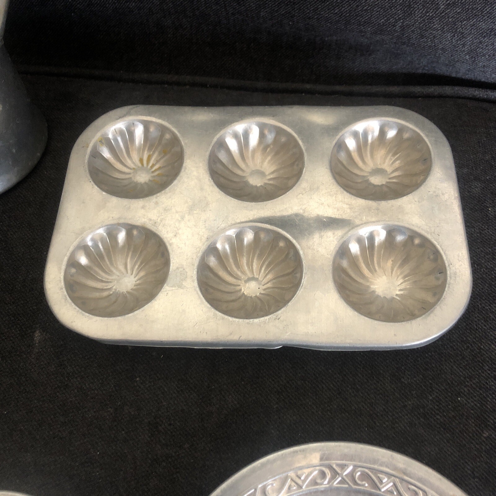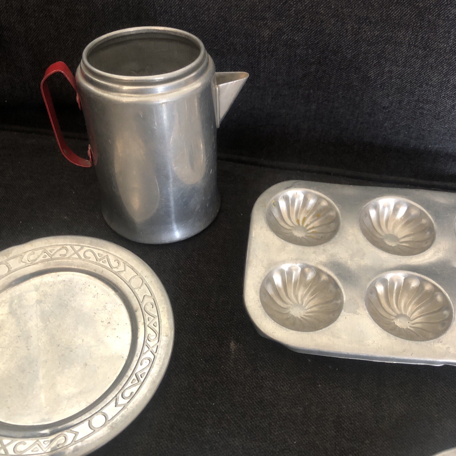 как выглядит Vintage 6 Pc Miniature Metal Kitchen Tea Cup Plates Pan Play Cookware Lot фото