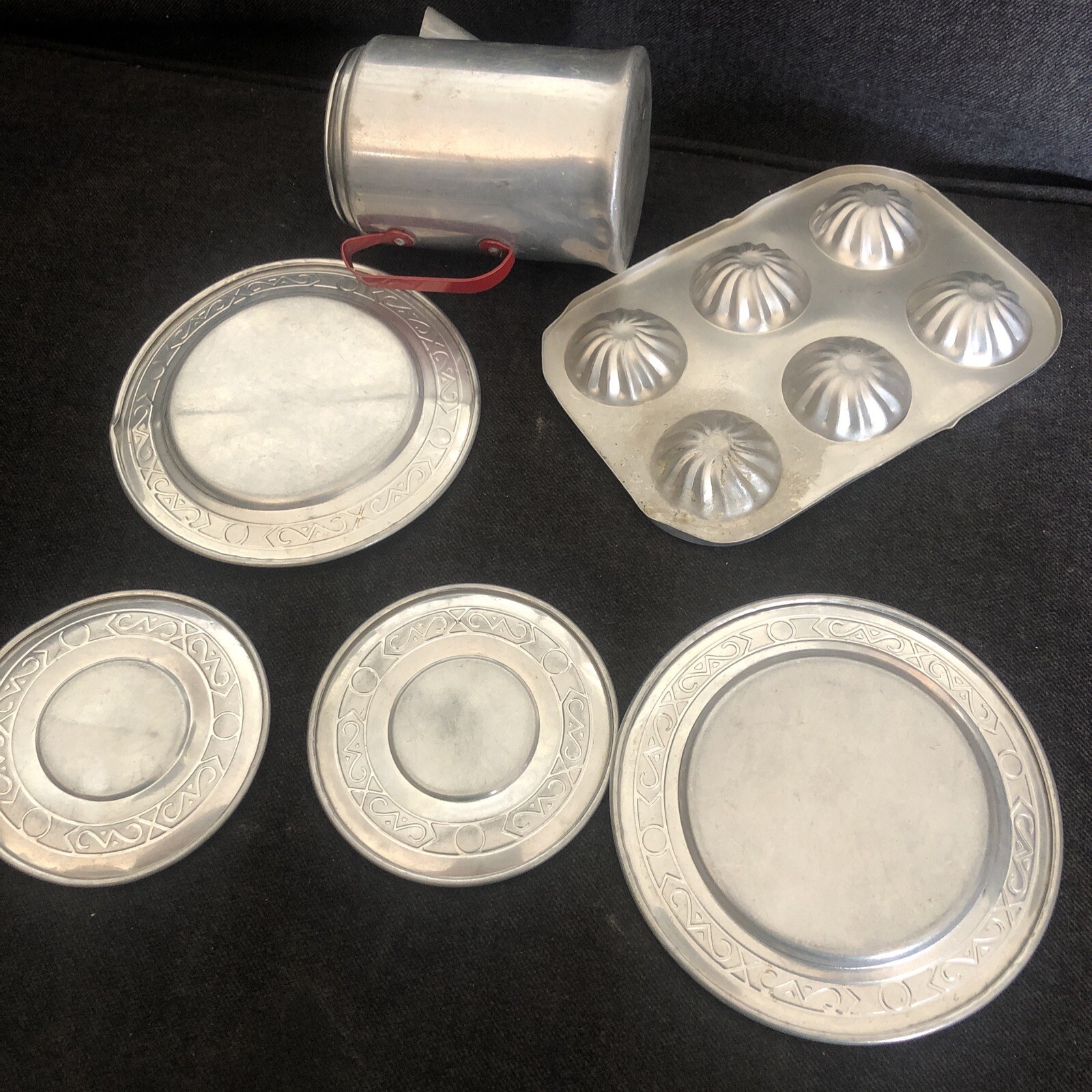 Vintage 6 Pc Miniature Metal Kitchen Tea Cup Plates Pan Play Cookware Lot