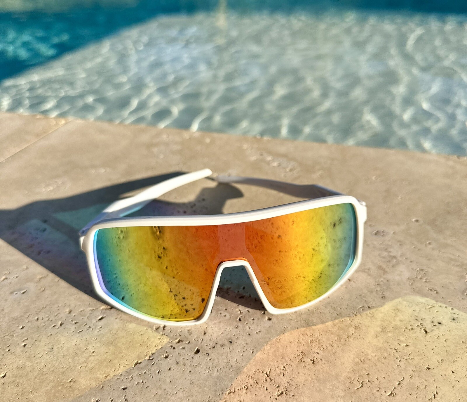 WHITE Sports Sunglasses Rainbow Lense, Mirror lenses, Wrap Sunglasses