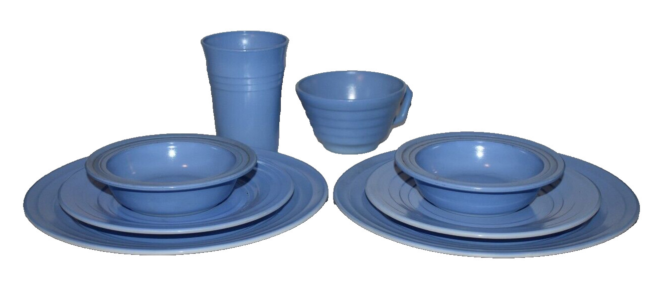 Vintage Hazel Atlas Children's Moderntone Dish Set Milk Glass Nine Piece BLUE