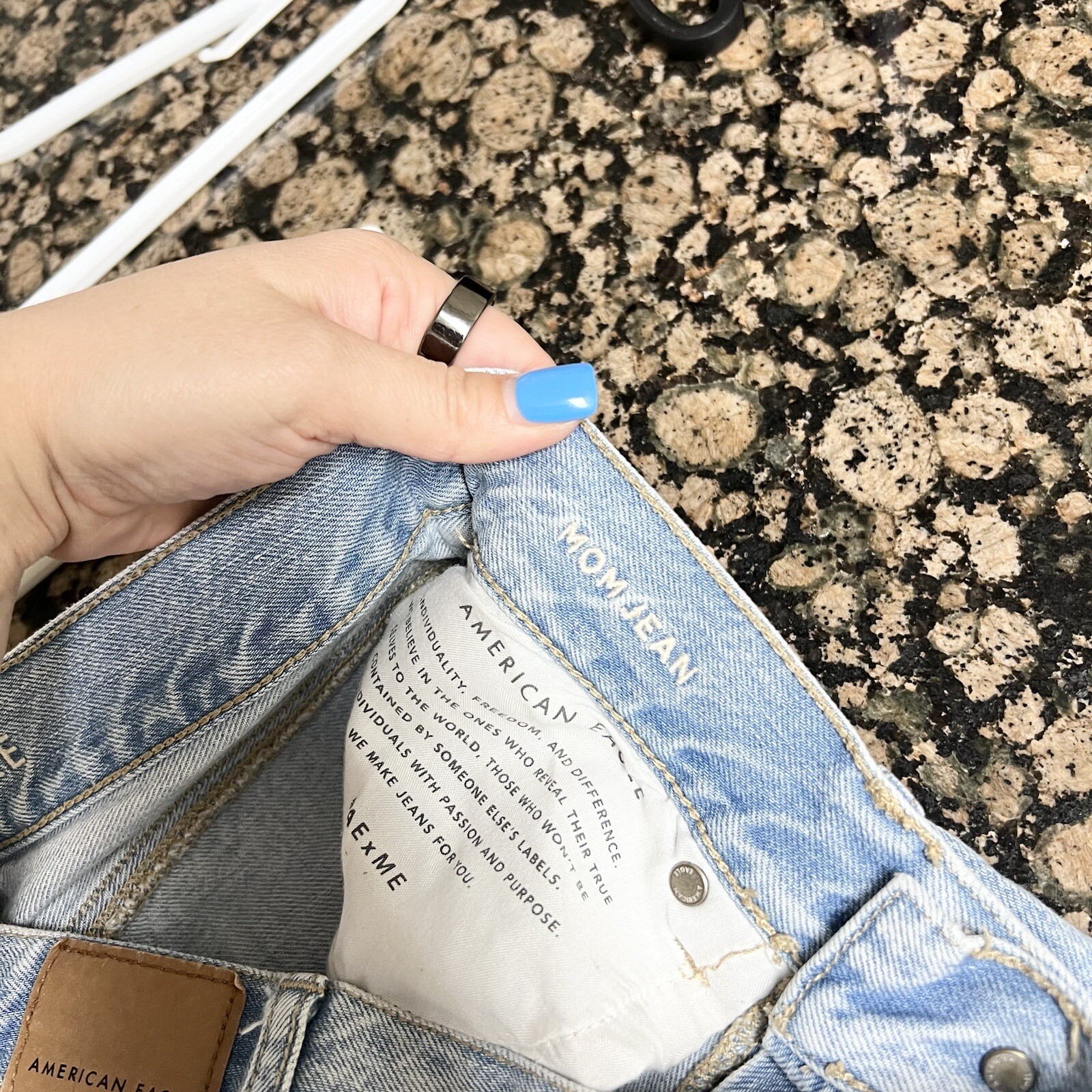 как выглядит American Eagle Mom Straight Jean Light Wash Blue Denim Size 4R Distressed фото
