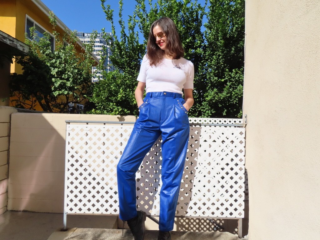 как выглядит 1980s Vintage Shiny Blue Jewel Pocket Pleated Pants sz Medium / 30-33" waist фото