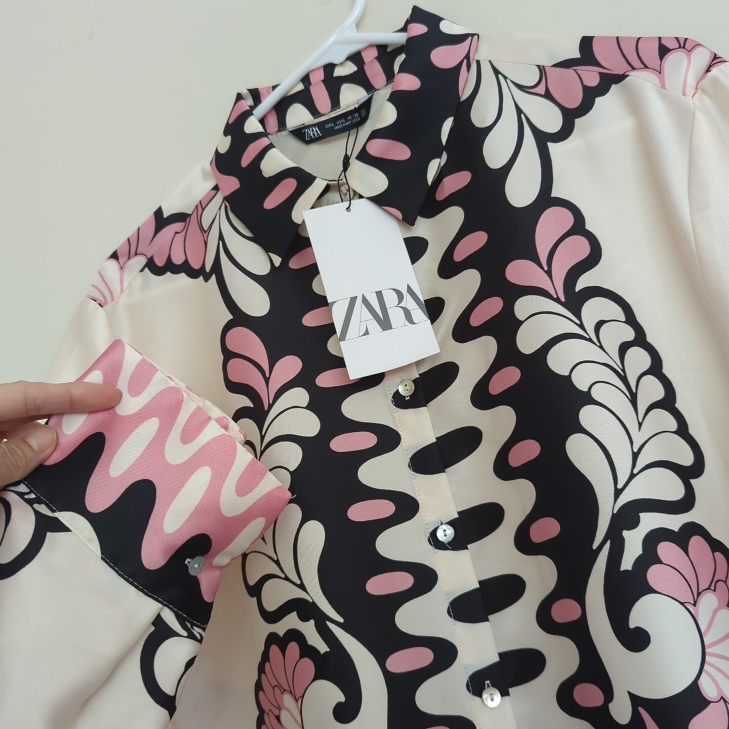 как выглядит ZARA NEW WOMAN FLORAL PRINT SATIN SHIRT ECRU PINK 8446/132 S M L фото