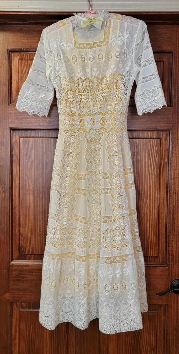 VTG Antique Edwardian 1900s White Lace Cotton Dress XXS Excellent Condition