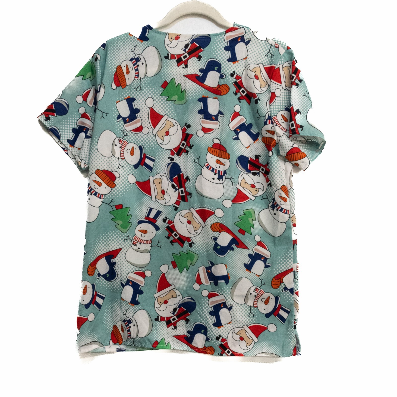 Christmas Scrub Top Womens Multicolor Snowman Penguin V Neck Short Sleeve L