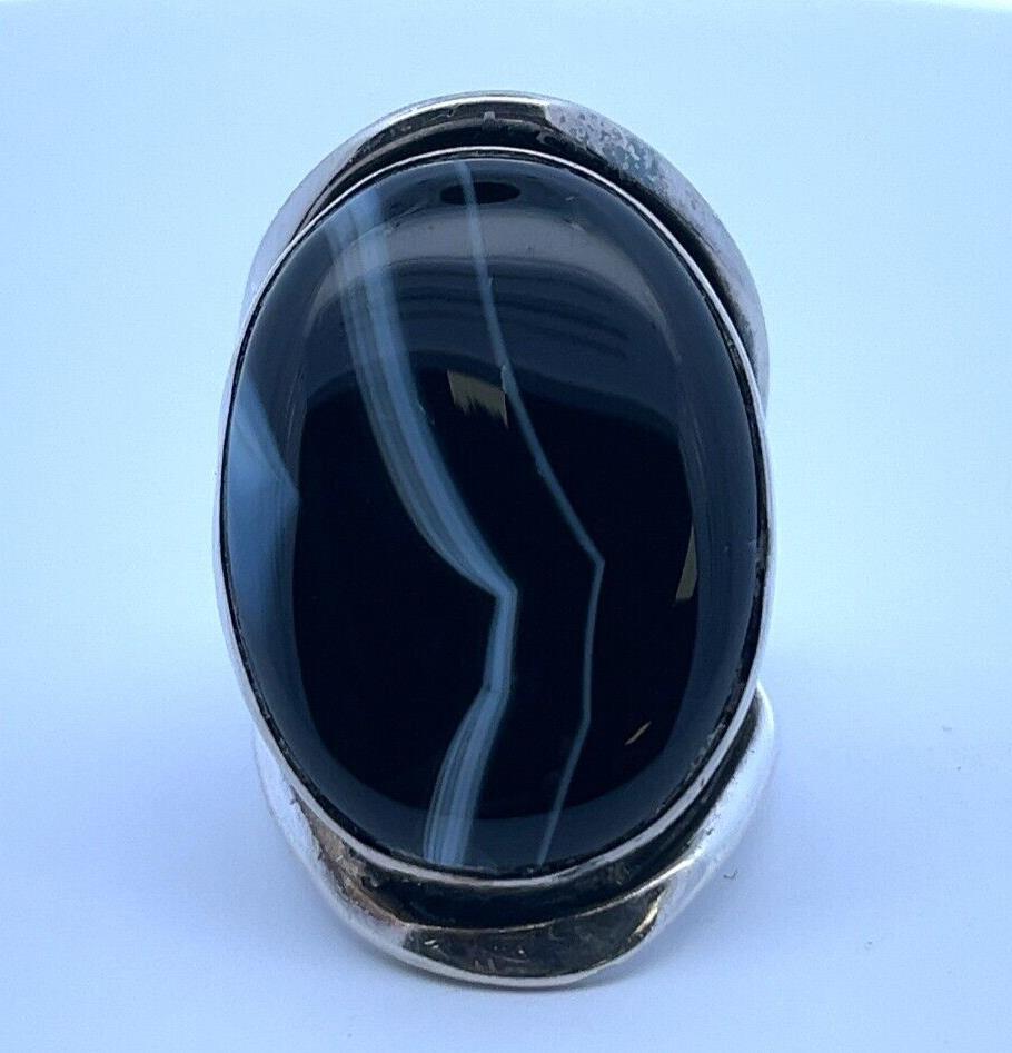 Vintage Large Sterling Silver Black Agate Natural Banded Ring 15.6 Grams Size-8