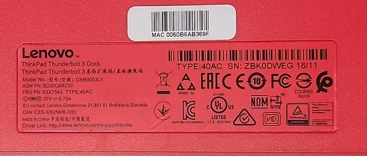 Lenovo ThinkPad Thunderbolt 3 Docking Station 40AC with 6.75A Power Adapter