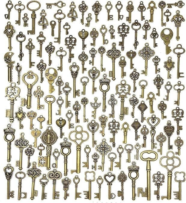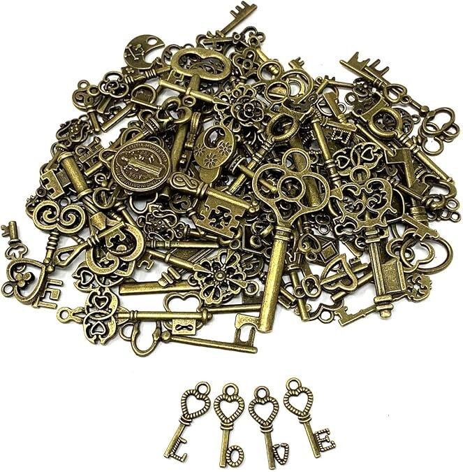 125 PCS Vintage Skeleton Key Set Charms Mixed Antique Style Bronze Brass for DIY