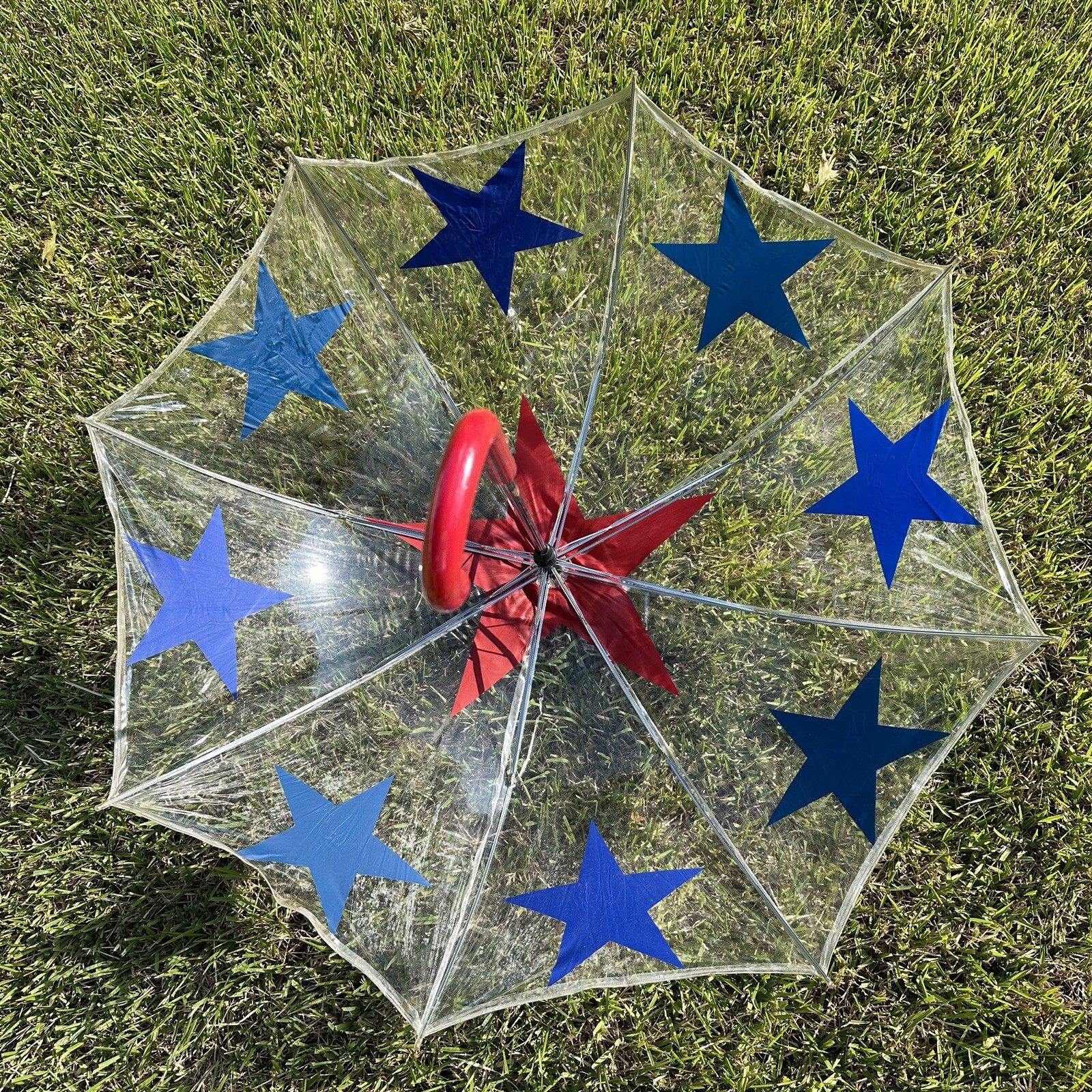 как выглядит New Vintage MACYs Hand Rain Umbrella Clear Classic Red Blue Stars Patriotic фото