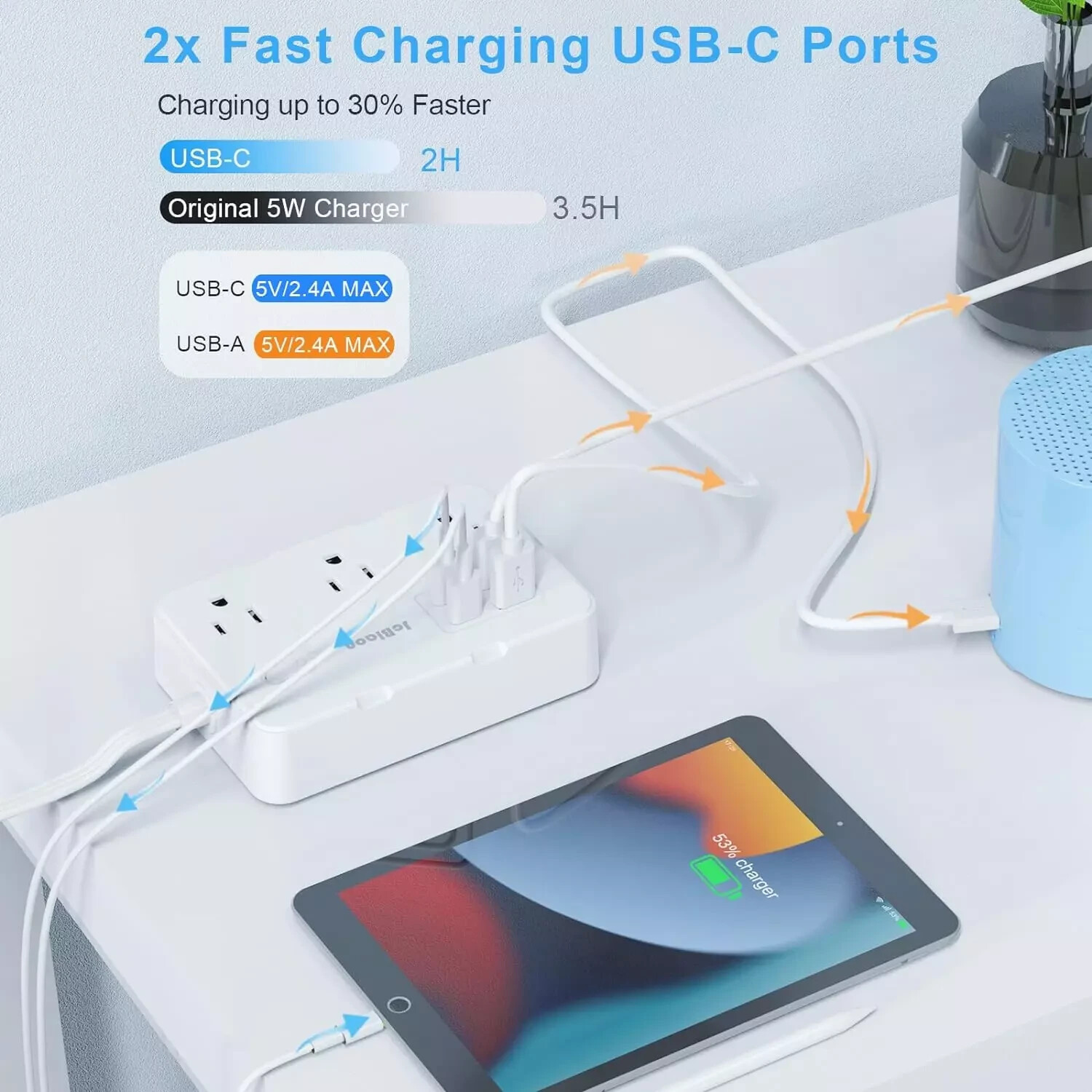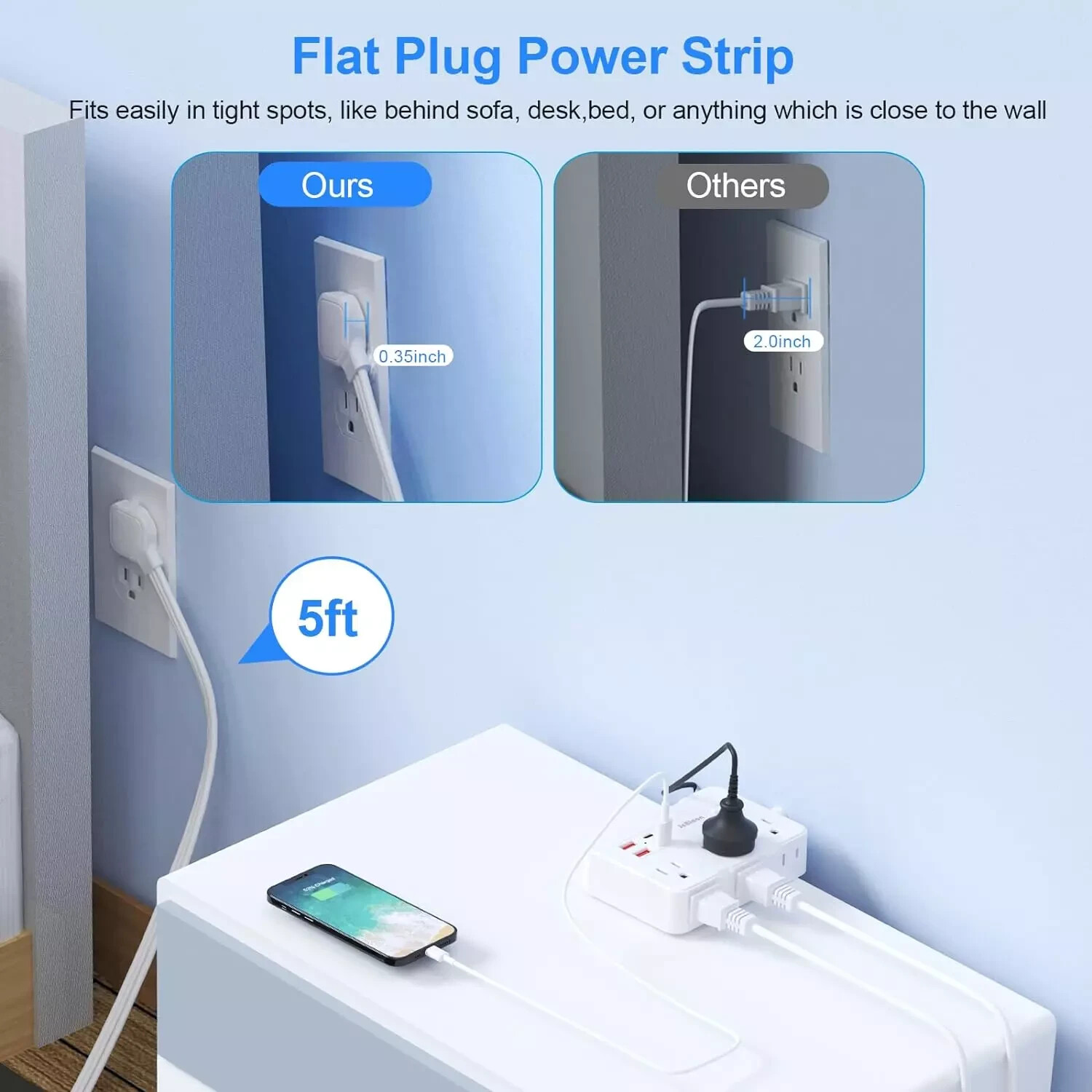 Flat Plug Power Strip Surge Protector, 5Ft Ultra Thin Extension Cord with 4 USB