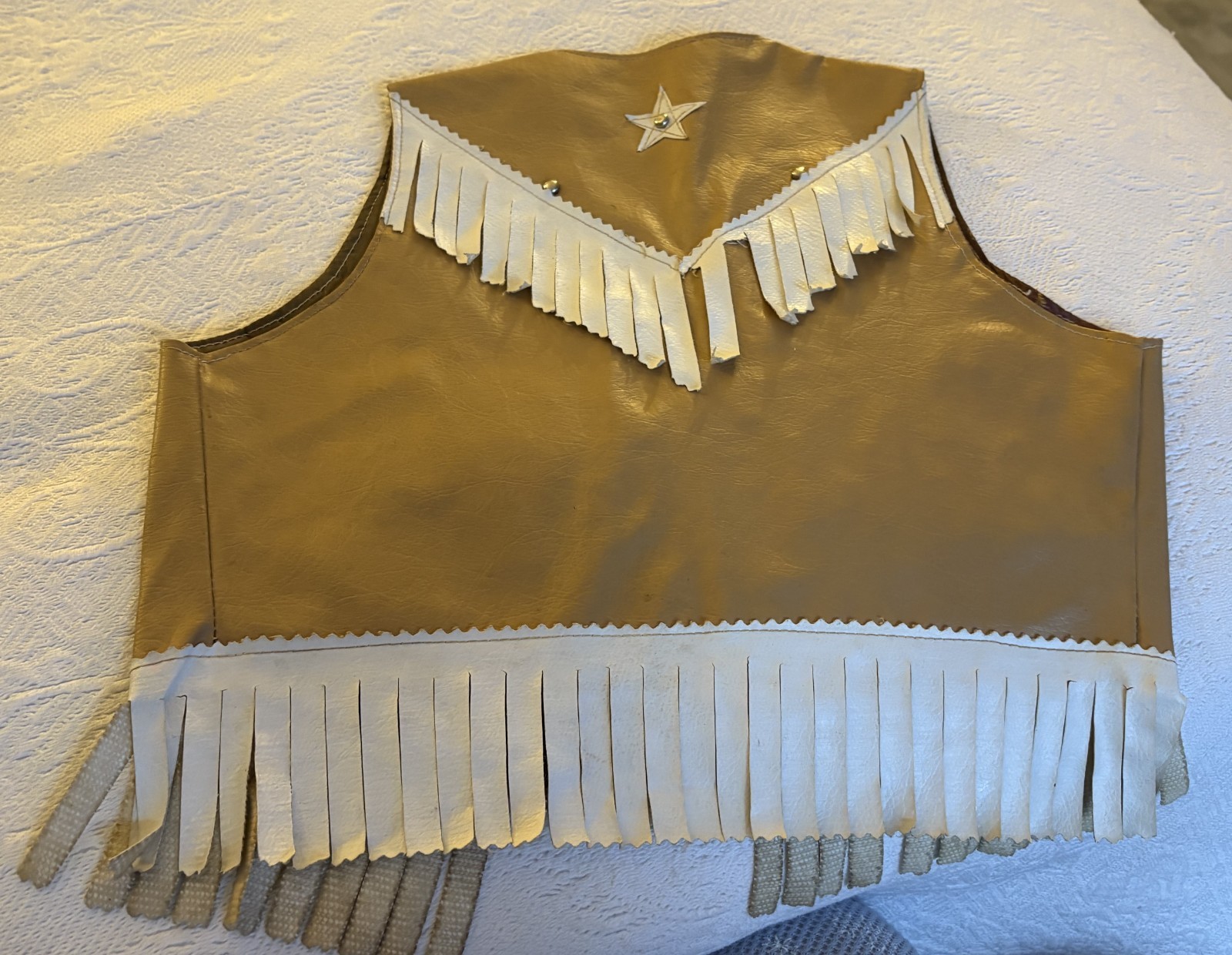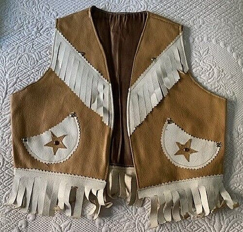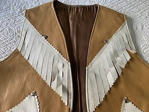 как выглядит VINTAGE 1950S TAN WHITE FRINGED W/SILVER STUDS CHILDS COWBOY VEST фото