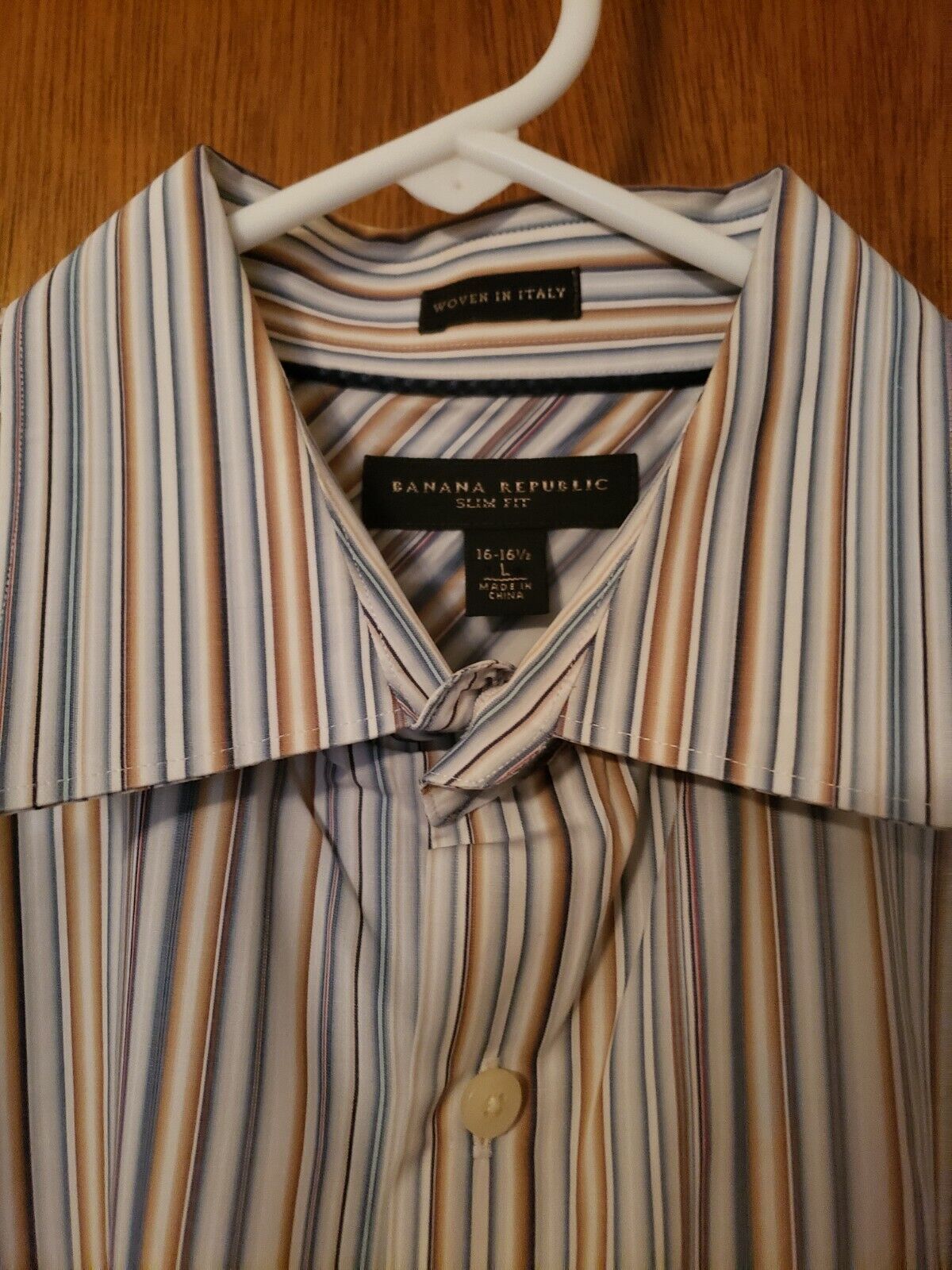 как выглядит Mens Banana Republic LS dress shirt tan blue stripe Size Large 16-161/2 LN фото