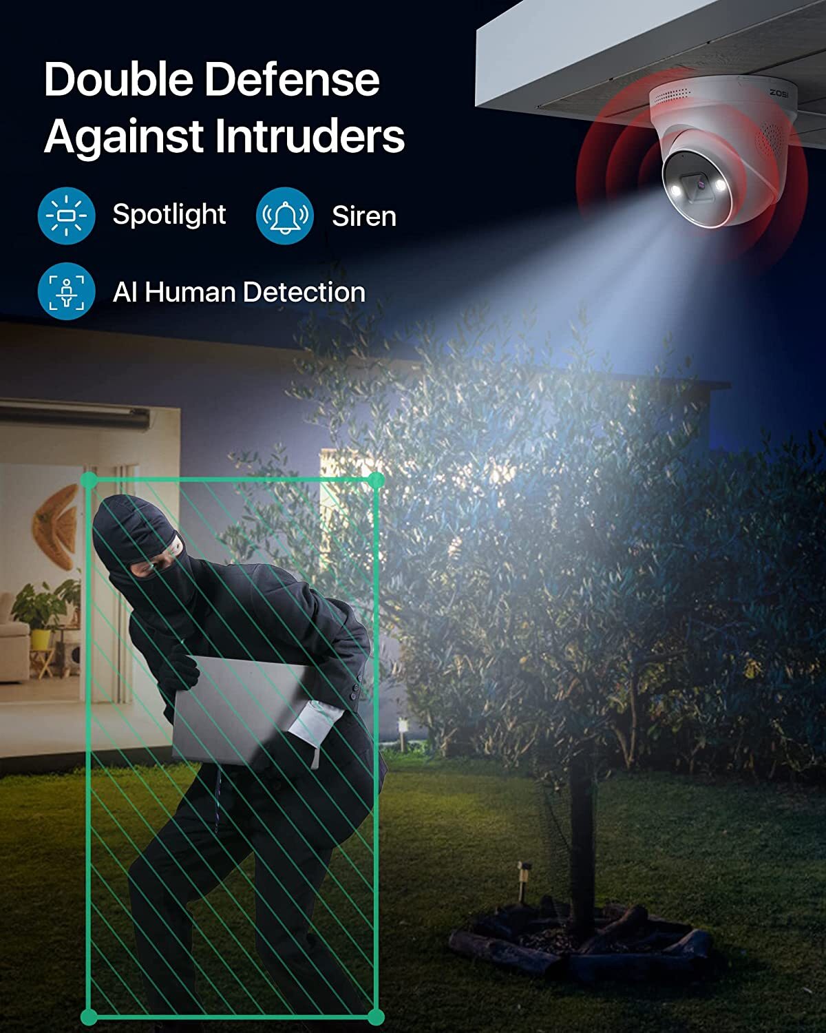 Automatic Motion Tracking, IP Intercom, Manual Sensitivity setting, Motion/PIR Activated, Multiple Language Support, Night Light, Night Vision, Outdoor/Weatherproof, Picture Frame, Plug in, Waterproof, Wi-Fi, Zoom, Weatherproof, Power over Ethernet (PoE), Wide Angle, AI Person Detection, AI Vehicle Detection, Two-Way Audio, Color Night Vision, 24/7 Recording, Instant playback, regular playback, event playback, Remote View, Spotlights&Siren, Sound&Light Alarm, Add-On Camera, Instant Alert, Smart Light, Wall Mounted |