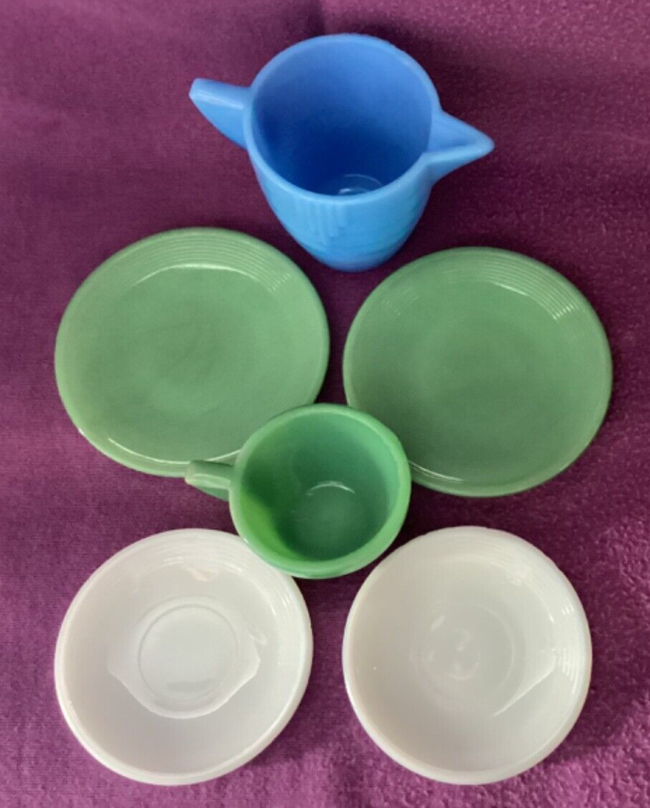 6 /Six DECO Akro Agate Child Tea Set 1 Pitcher 2 Jadeite Plates 1 Cup 2 Saucers