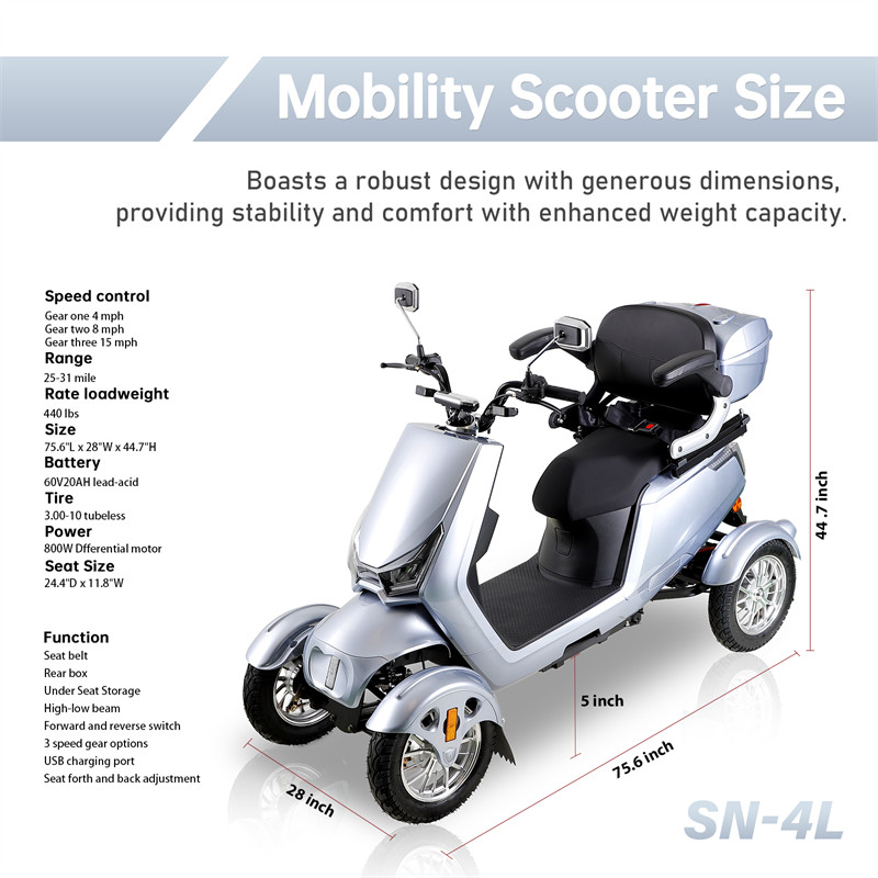 4 Wheel Electric Mobility Scooter 800W 60V 20AH 500lbs 31 miles for Adult Senior