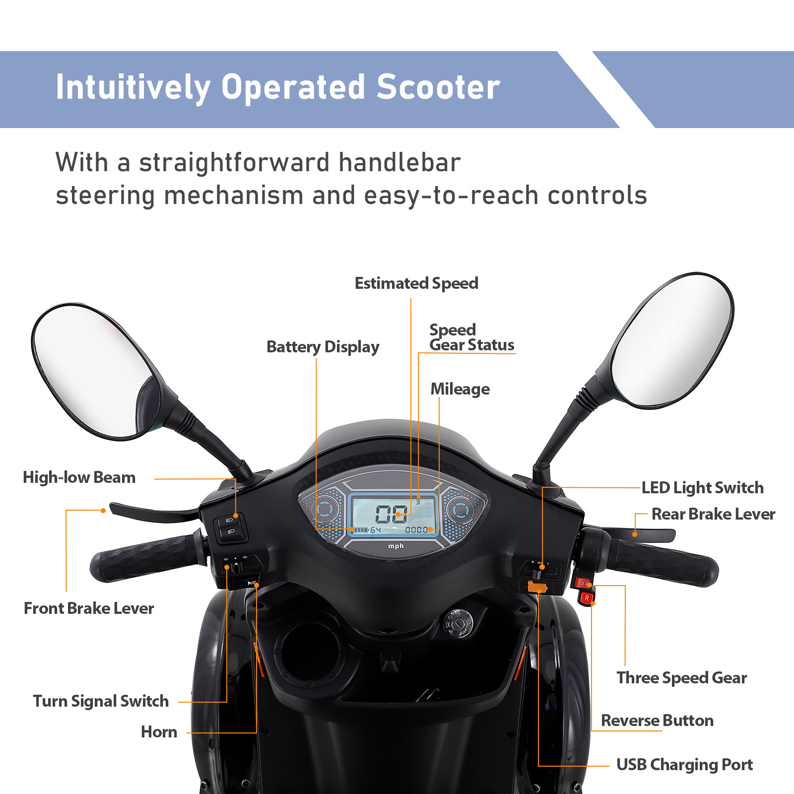 Особенности: Bumpers, Heavy Duty, LED Headlight, Padded Armrest, Rear Caster/Anti-Tipper, Rear View Mirror, Storage Compartment