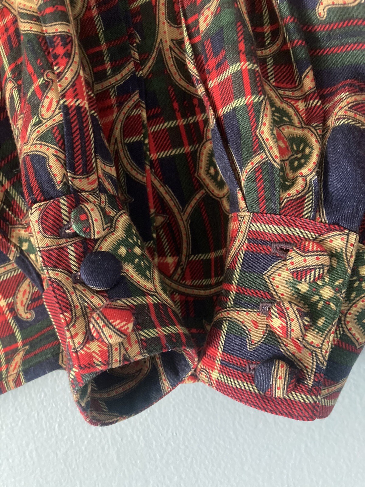 Vintage 80s Baroque Blouse Plaid Navy Green Red M/L