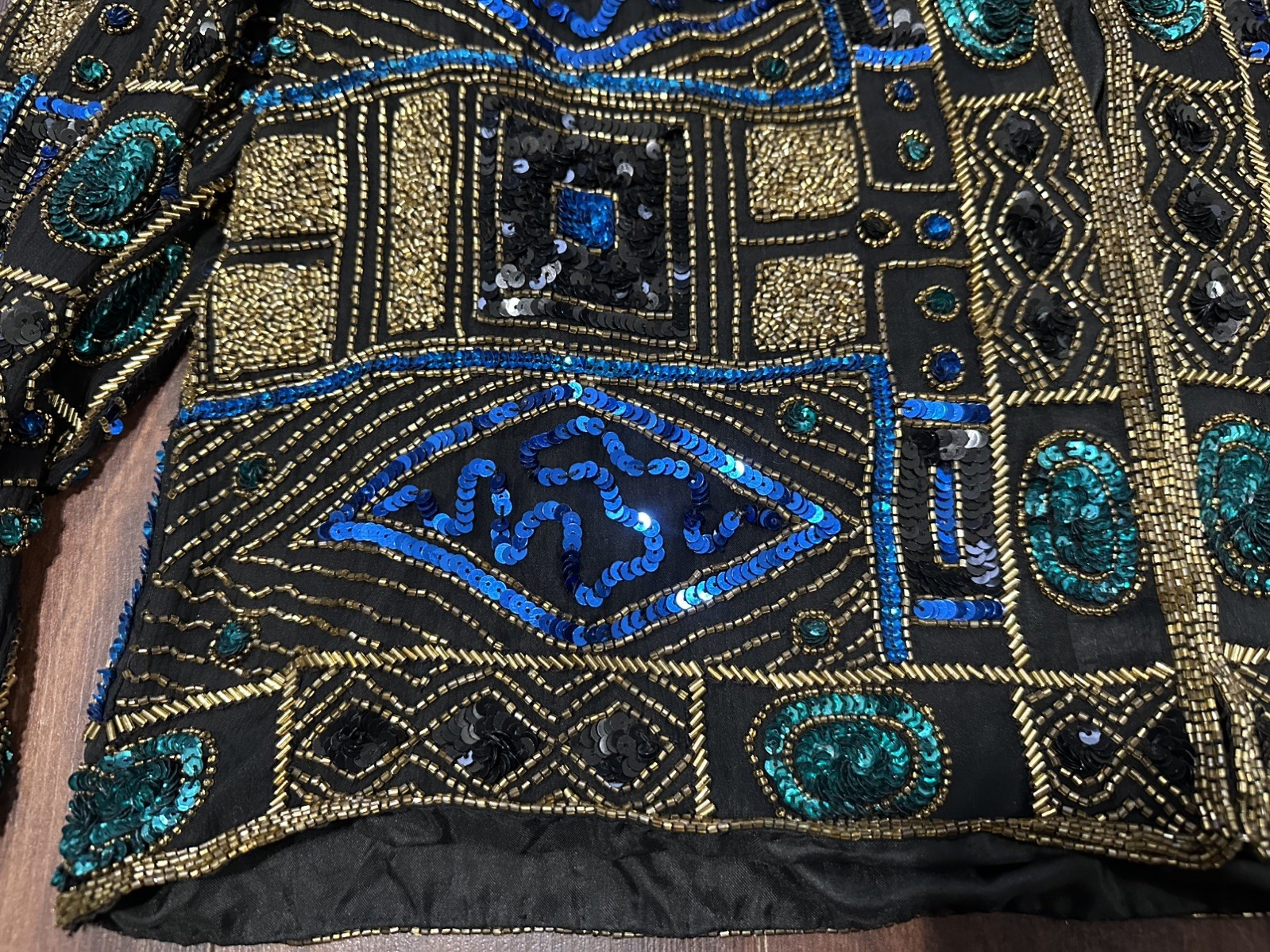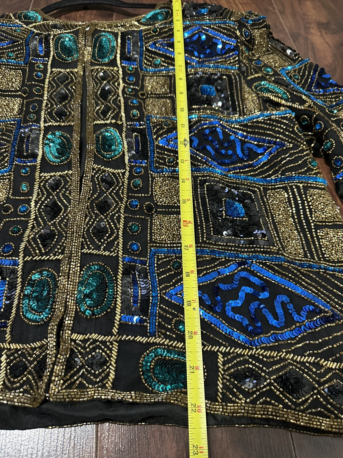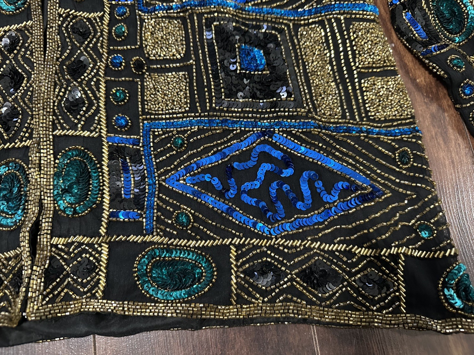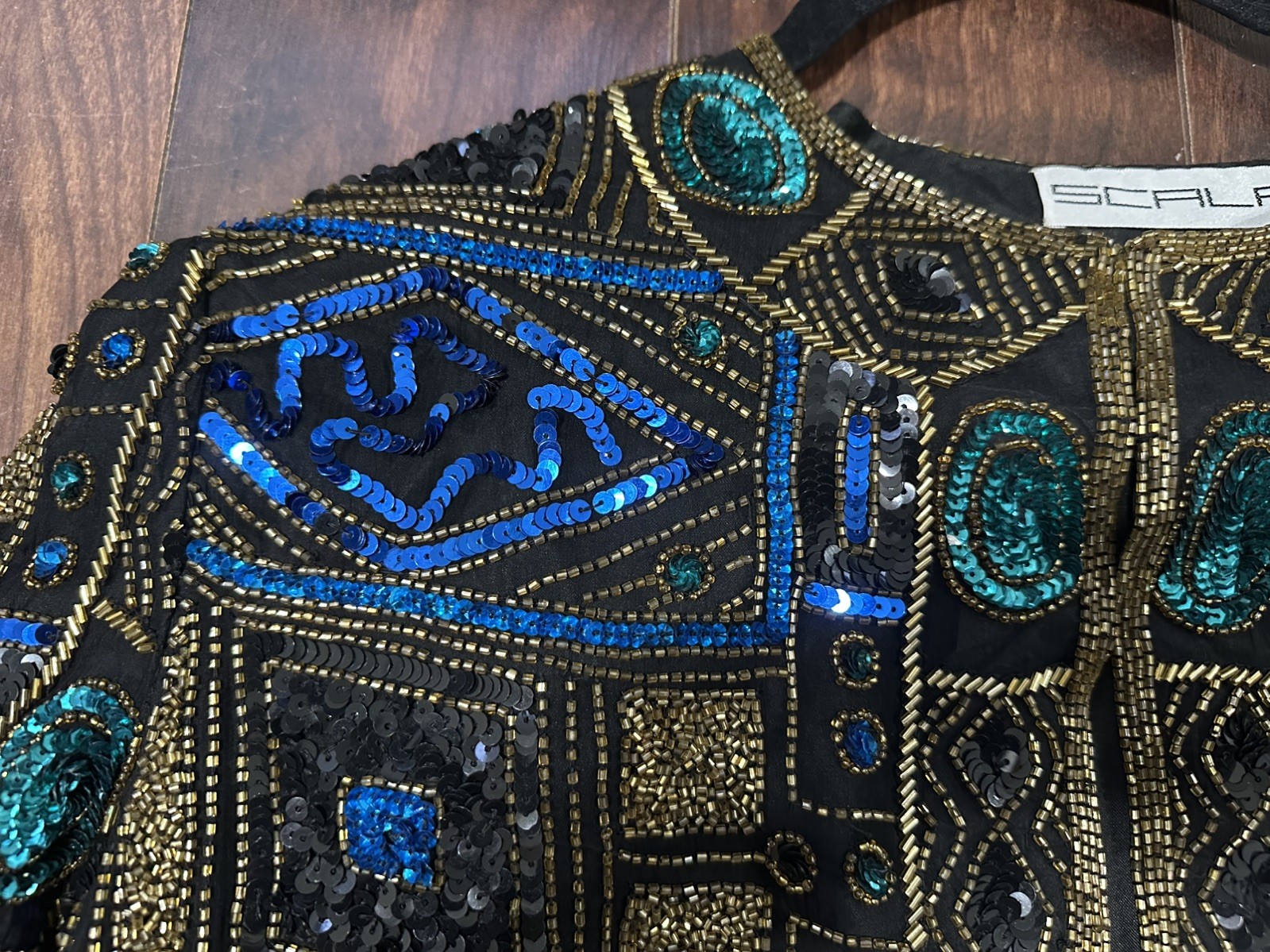 Vintage Y2K Scala Hand Beaded Sequin Black Gold Blue Silk Evening Jacket XL