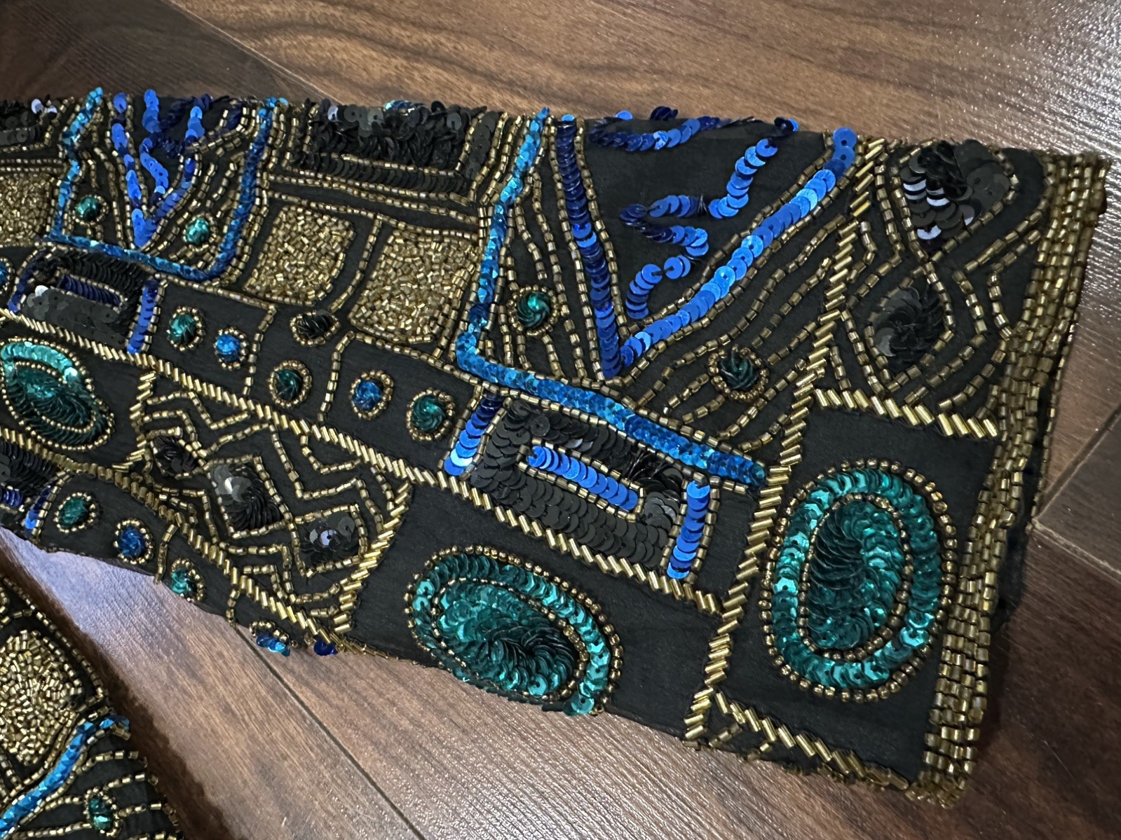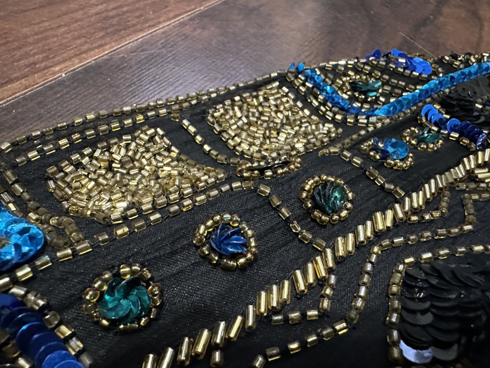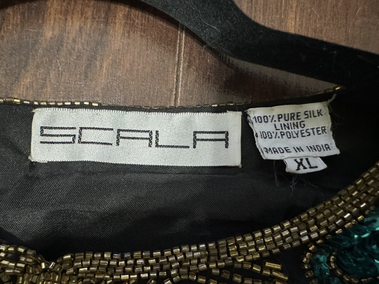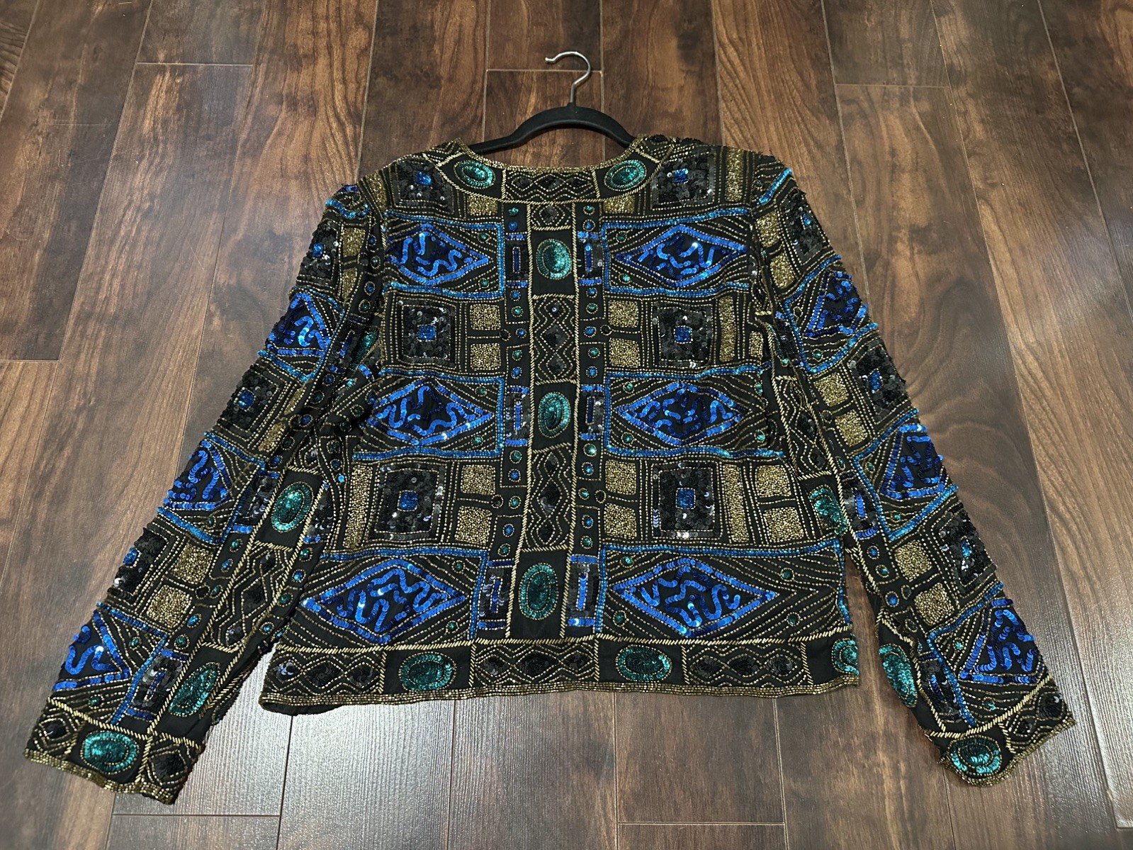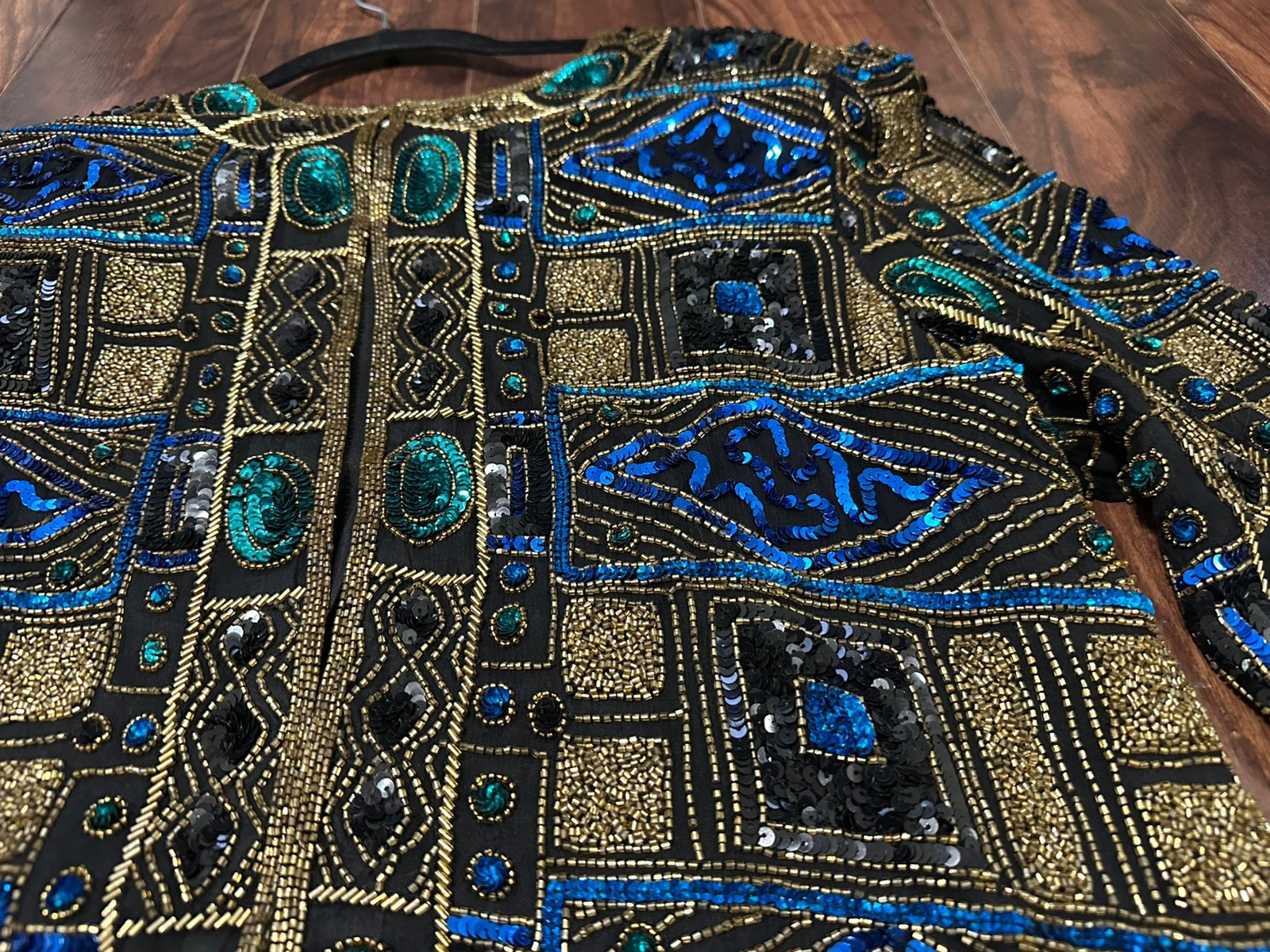 Vintage Y2K Scala Hand Beaded Sequin Black Gold Blue Silk Evening Jacket XL