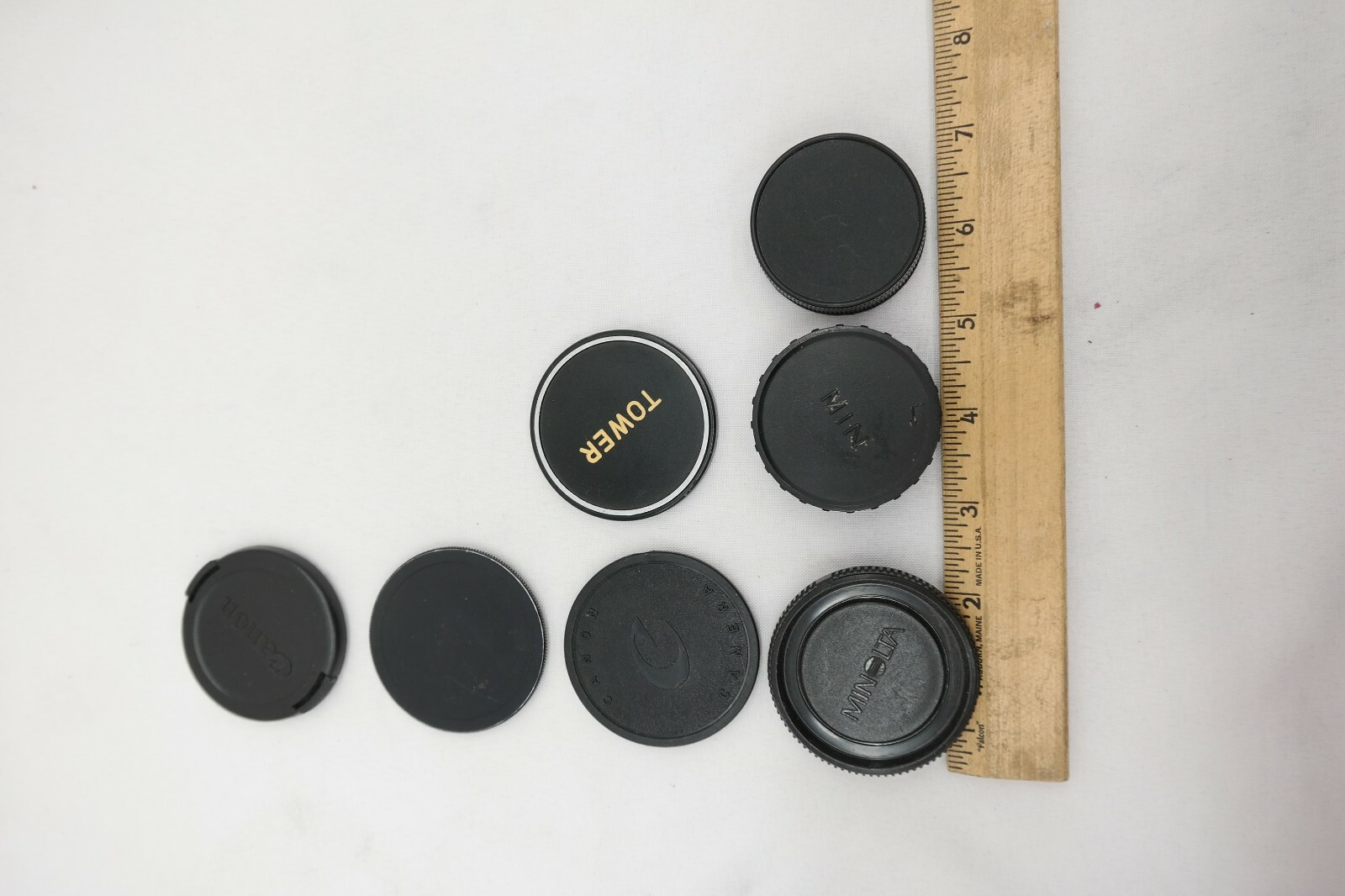 Lot of 7 Vintage Camera Lens Caps Mixed Lot with Camera Accessories JG