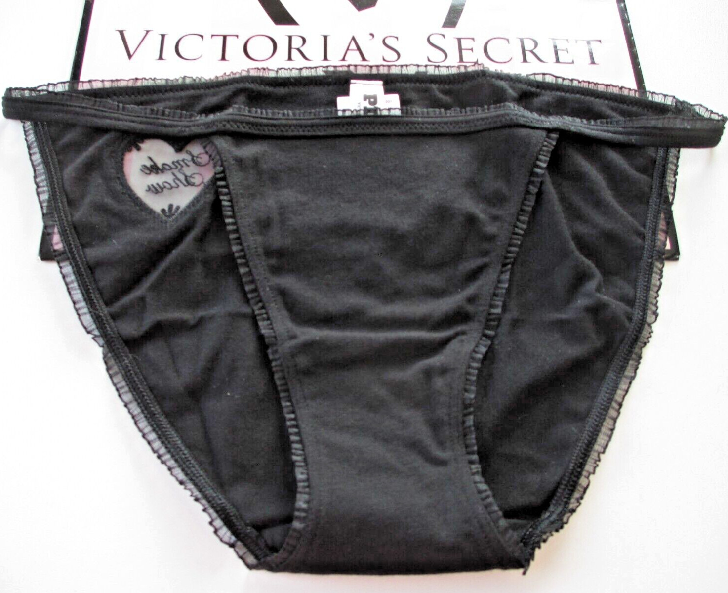 как выглядит VICTORIAS SECRET PINK Cotton String Bikini Panty VS Ruffle Heart S M L XL Black фото