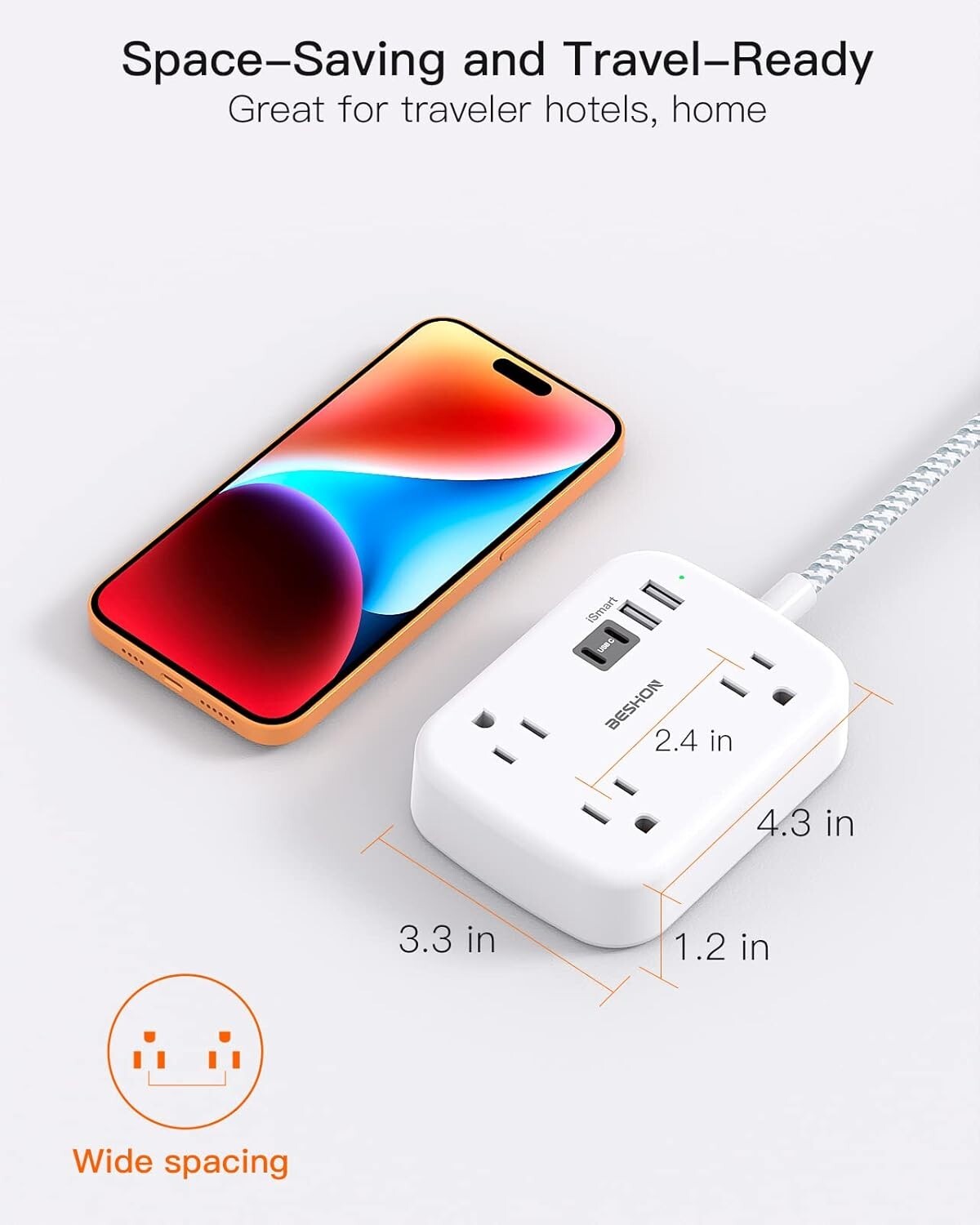 как выглядит Flat Plug Power Strip, 5 Ft Extension Cord with USB Port, 3 Outlets 4 USB Ports фото
