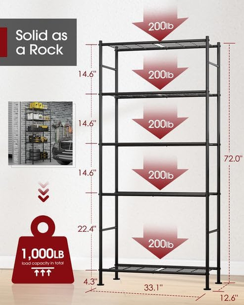 Storage Shelves - 5 Tier Shelf Organizer, Heavy Duty Garage Shelving Unit with L