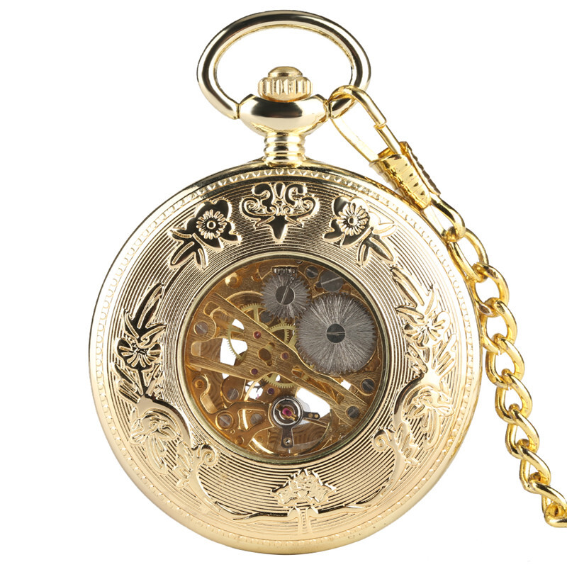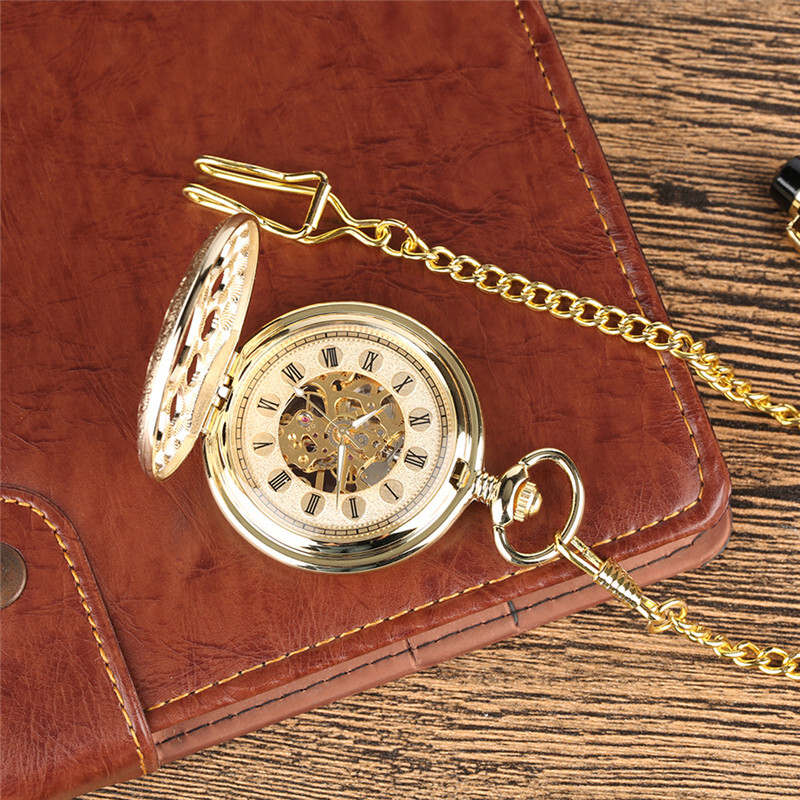 Gold Tone Skeleton Mechanical Pocket Watch Roman Numerals Dial with Chain Gifts
