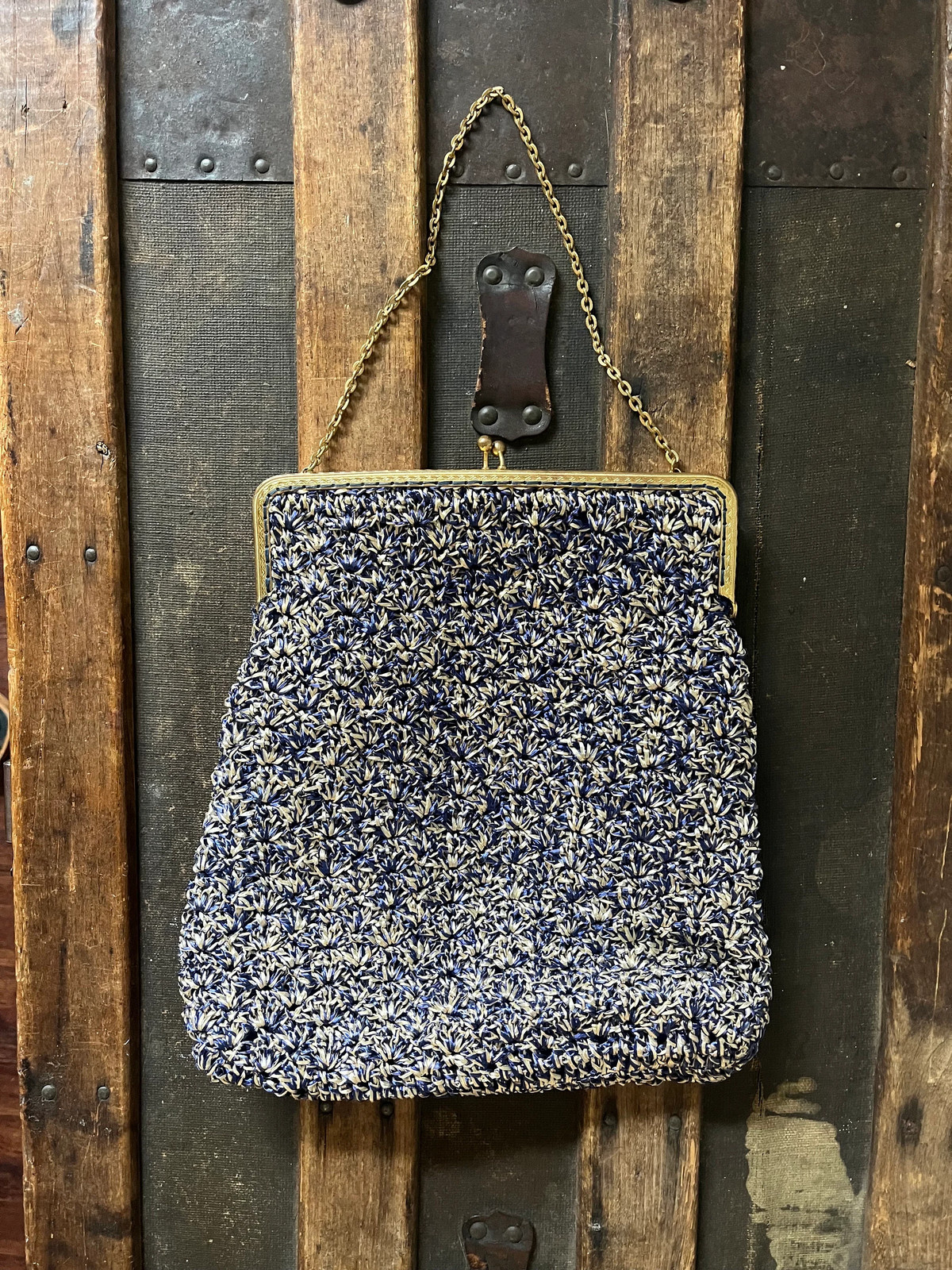 как выглядит WOVEN RAFFIA Vintage 1940s Crocheted Pouch Purse with Silk Lining Chain Top H фото