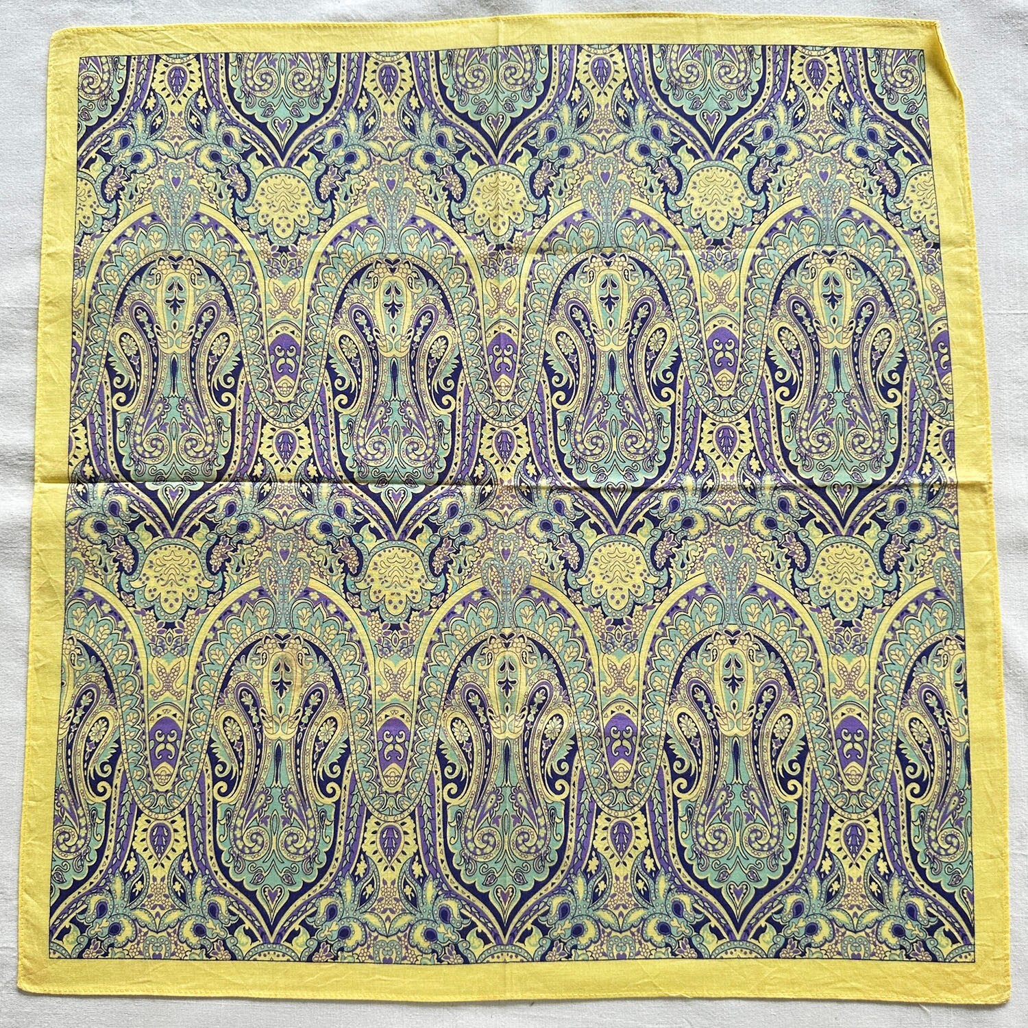 Vintage Mens Handkerchief Yellow Cotton Blue Paisley Floral Damask Art Hanky 20