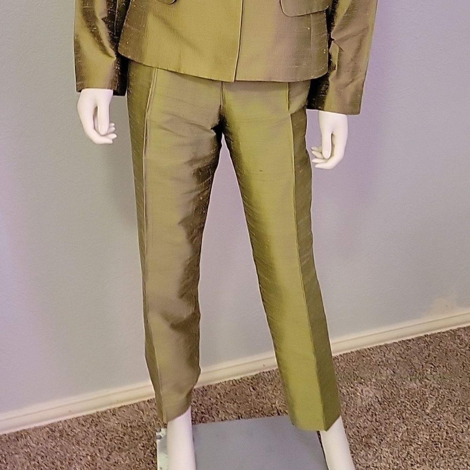 как выглядит VTG PAULE VASSEUR 1960s Atomic Silk Taffeta Metallic Olive Green Pant Suit фото