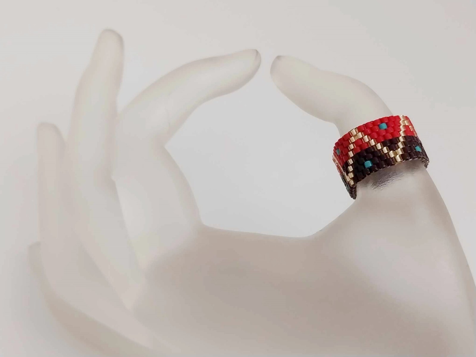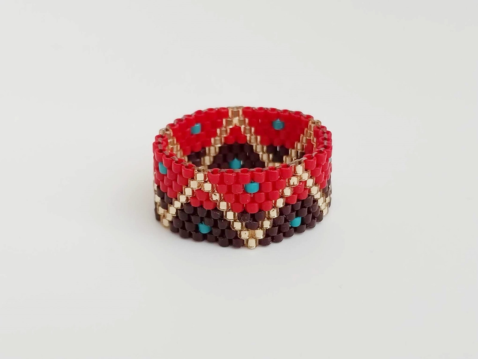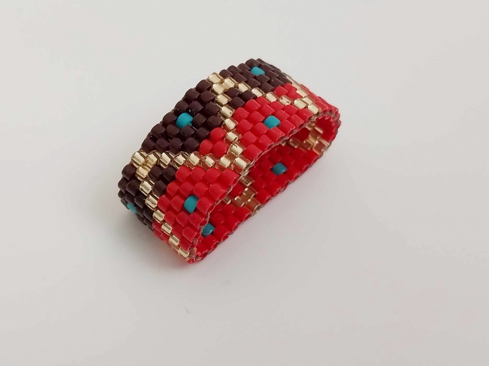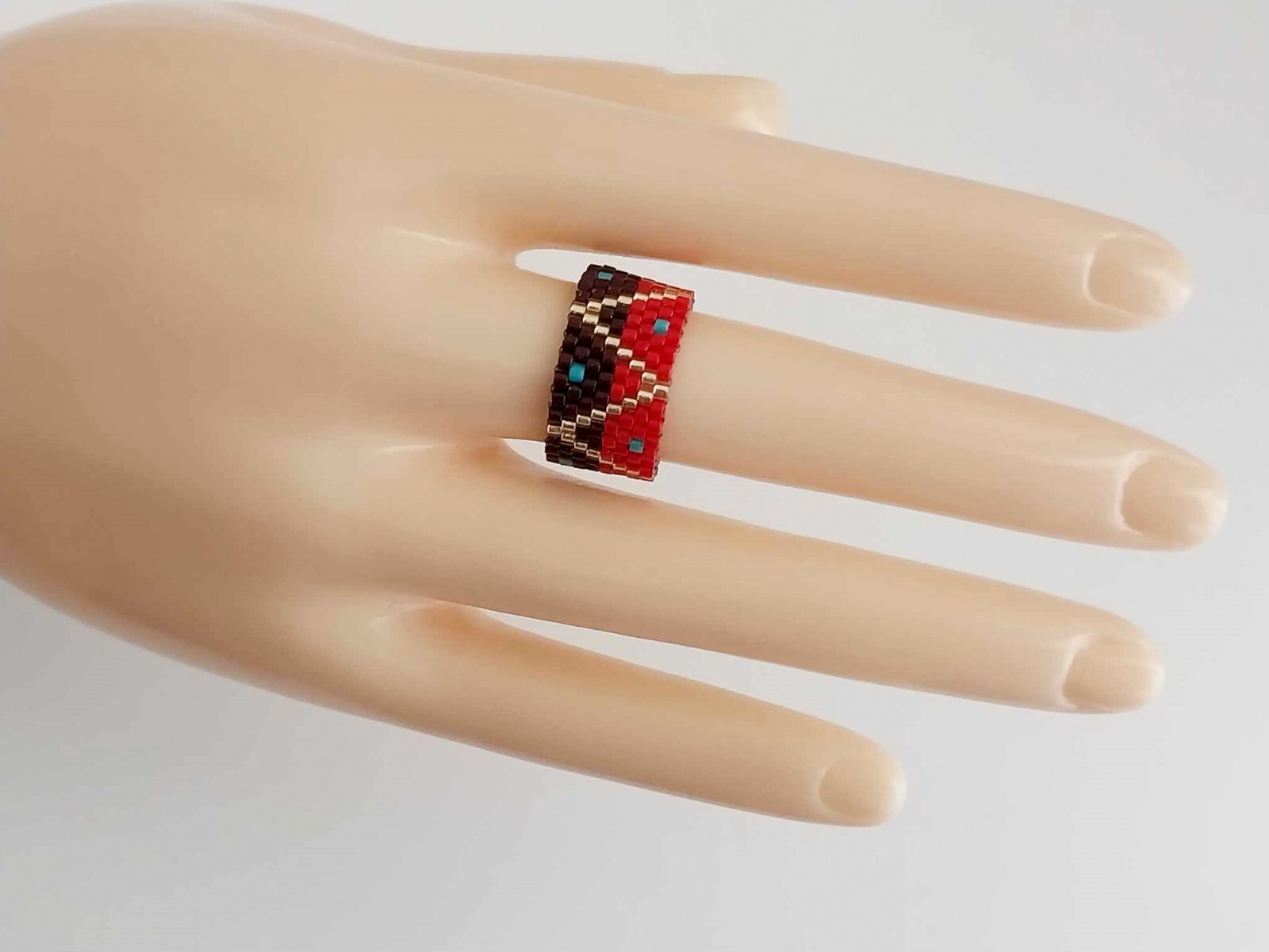 Beaded Peyote Ring in Red, Brown, Gold and Turquoise / Size 8 Seed Bead Ring