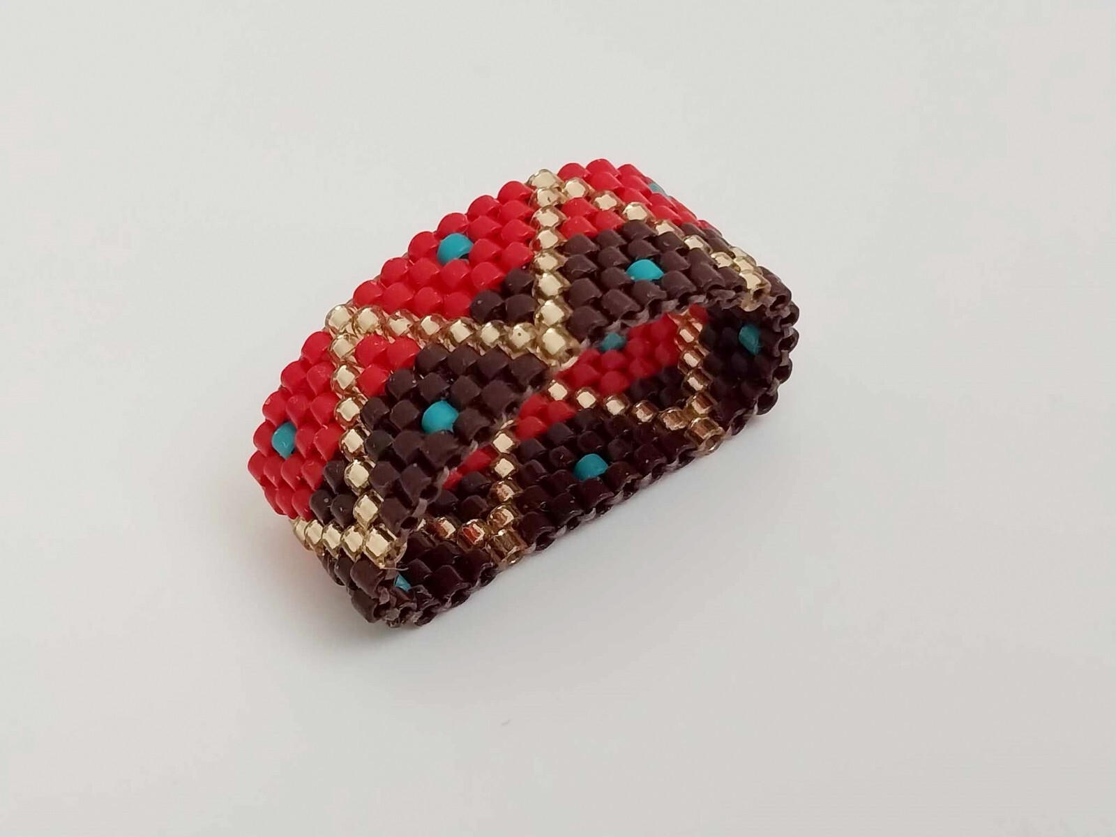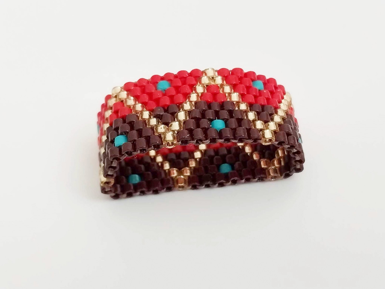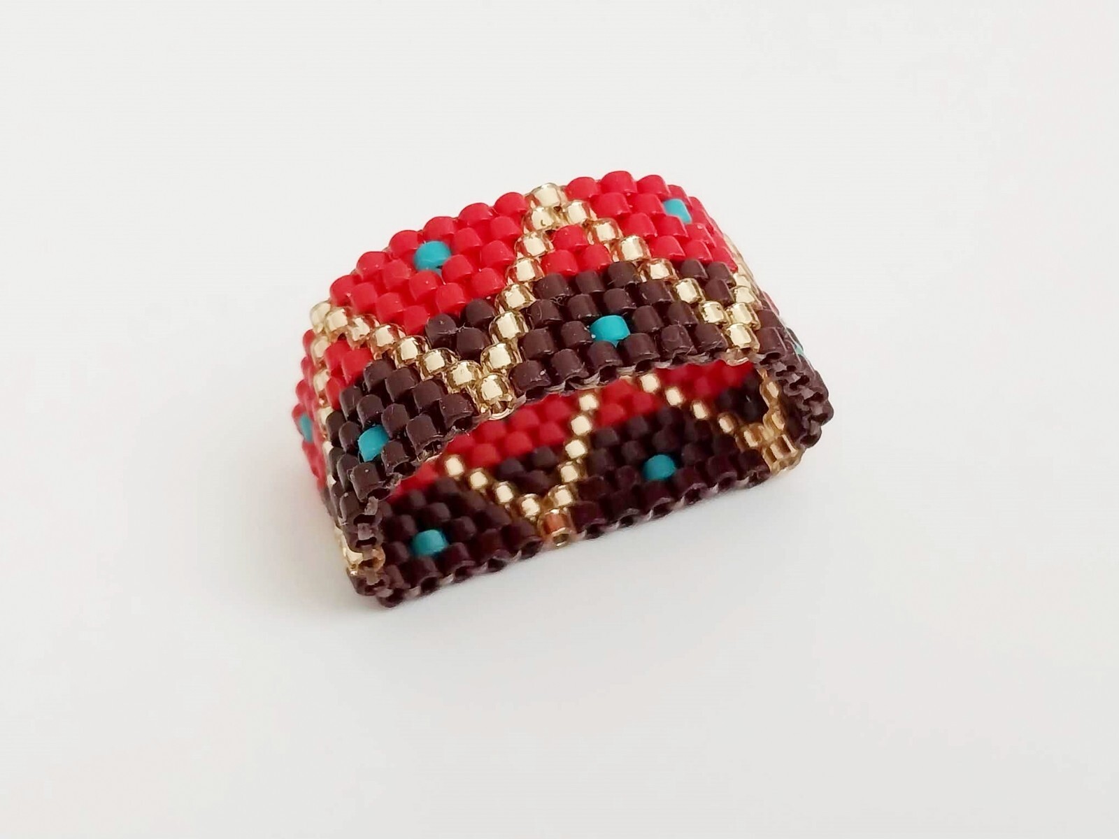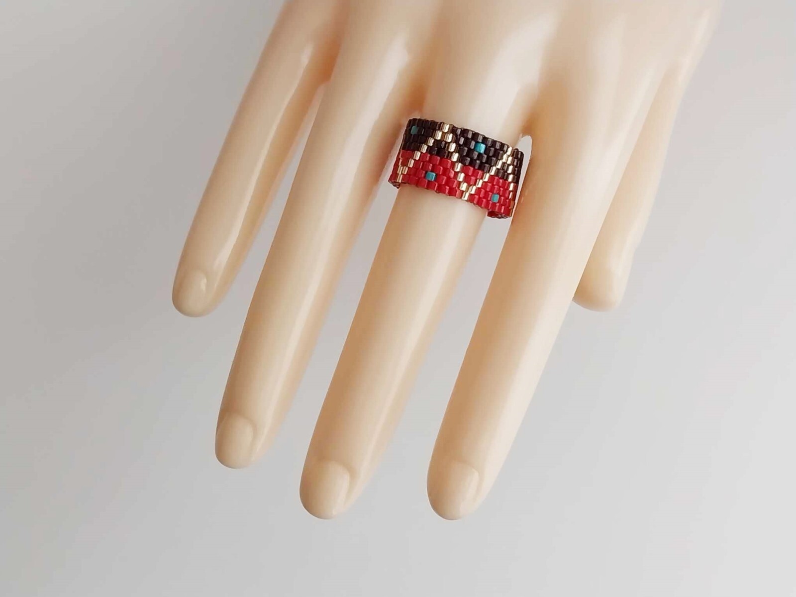 Beaded Peyote Ring in Red, Brown, Gold and Turquoise / Size 8 Seed Bead Ring