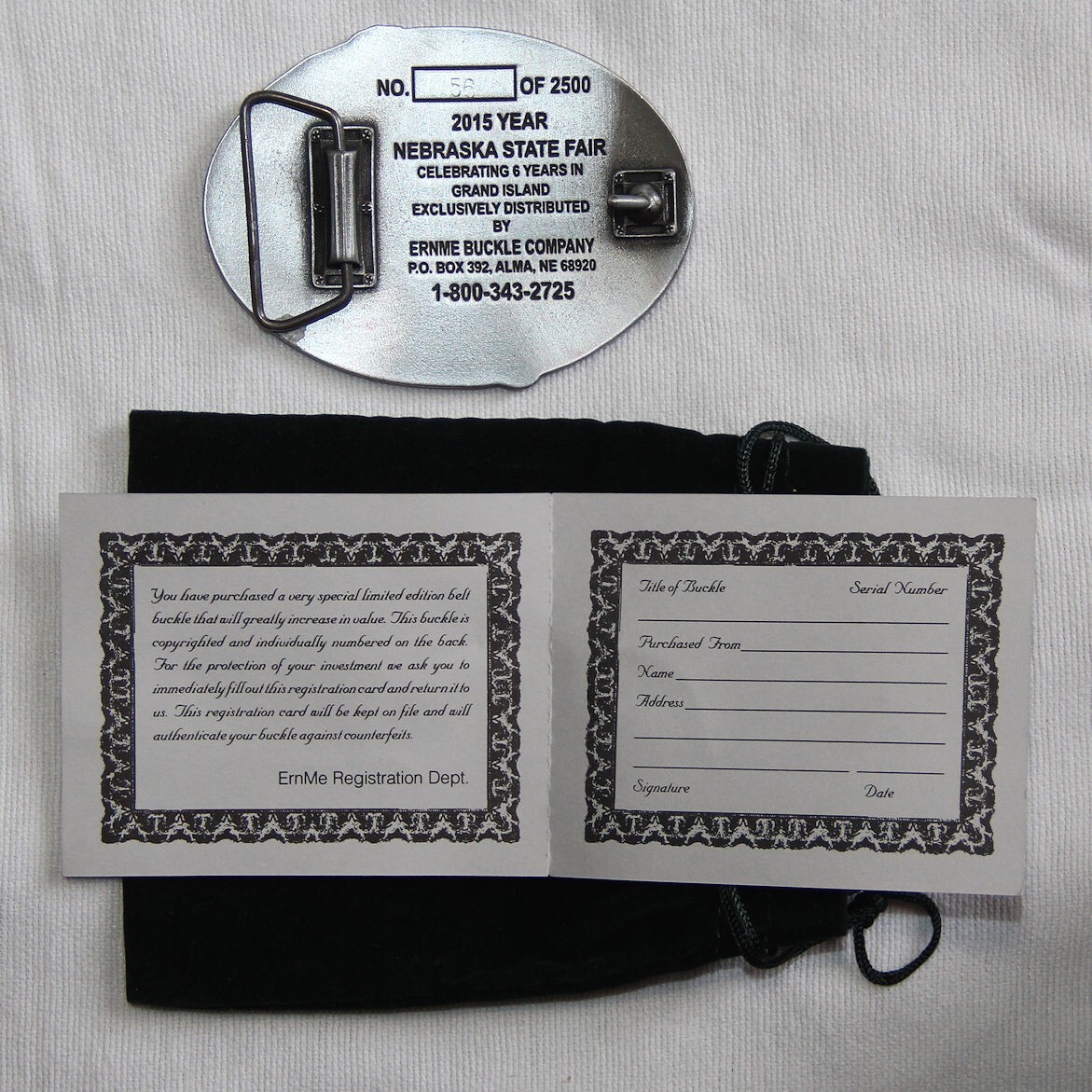 VINTAGE 2015 NEBRASKA STATE FAIR BELT BUCKLE W/CERTIFICATE OF REGISTRATION BAG