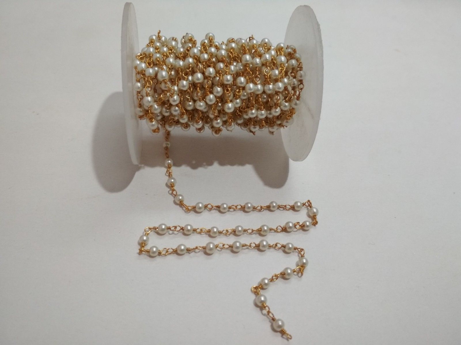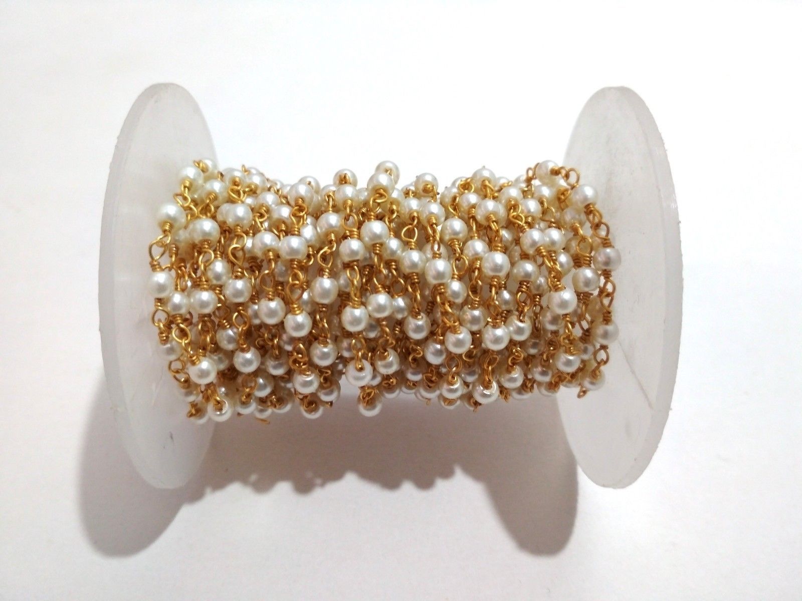 10 Feet Pearl Round Smooth 3-4mm Beads, Rosary Beaded Chain Gold Plated Wire