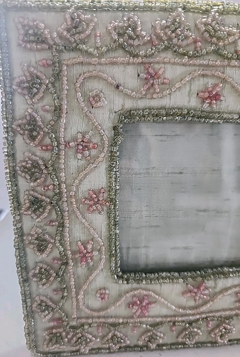 Boho Picture Photo Frame Seed Beads Green Fabric 6x6 Square