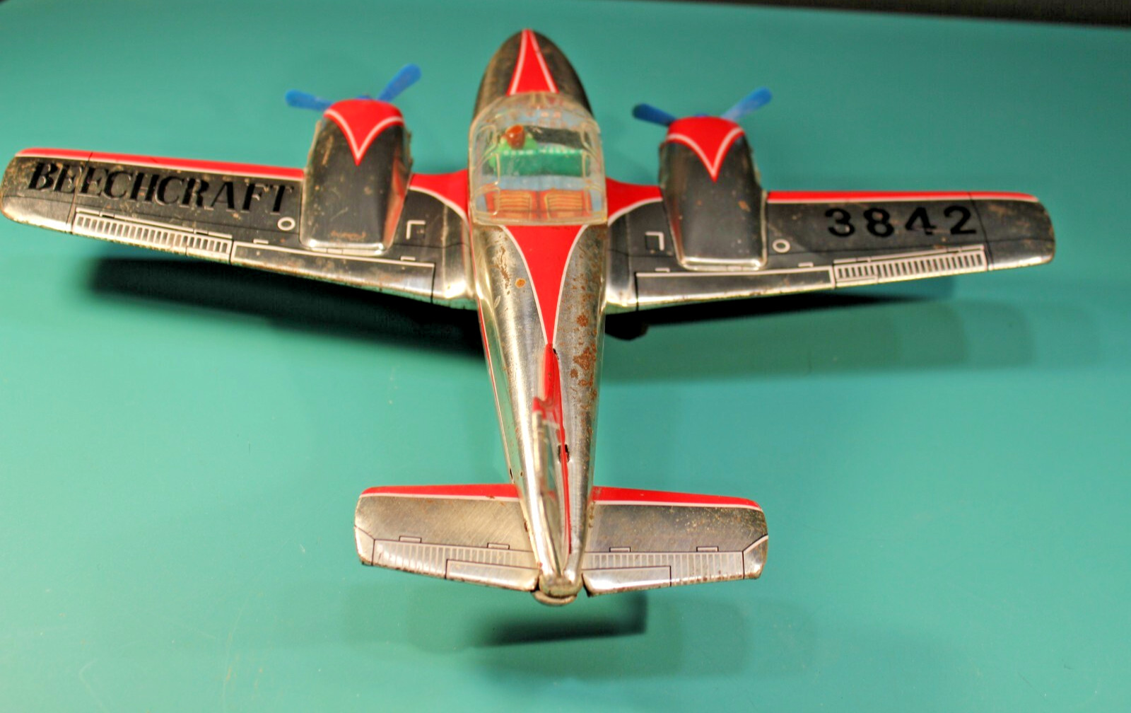 BEECHCRAFT 3842 DUAL PROP TIN TOY AIRPLANE MODERN TOYS JAPAN, 15 3/8 WINGSPAN