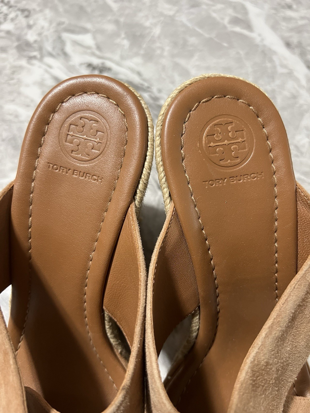 как выглядит Tory Burch Chocolate Brown Bailey Platform Wedge Espadrille Mule Size 8.5M фото