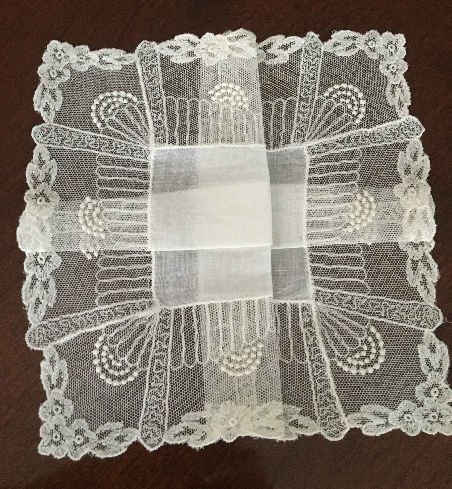 как выглядит NOS Vintage Ivory Linen Hankie w Wide Net Lace Border Floral Edge Bridal Wedding фото