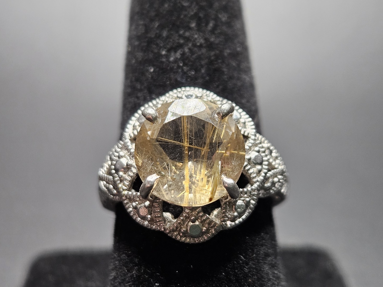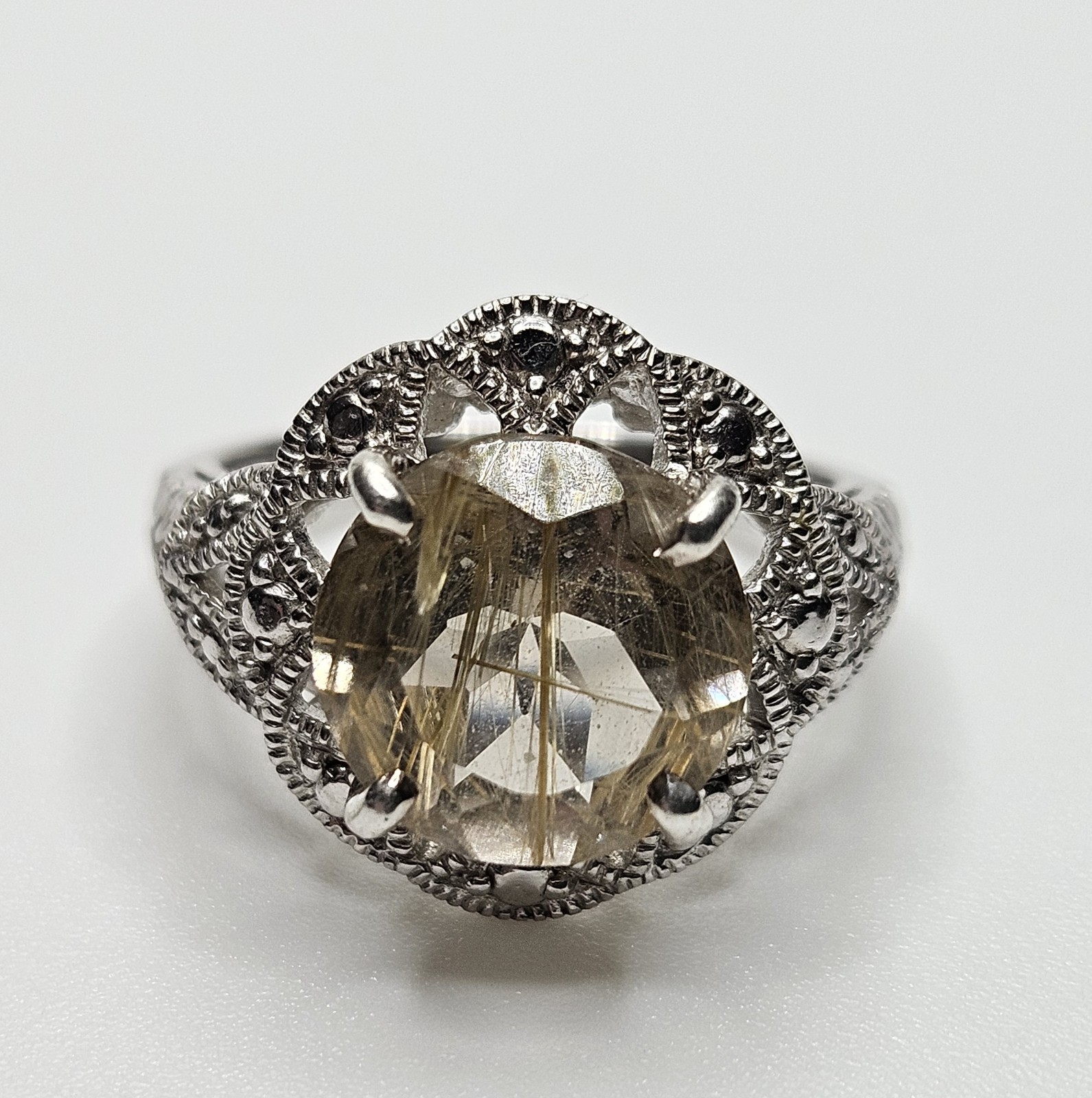 925 Sterling Silver 10mm Round Rutilated Quartz Ring Size 6